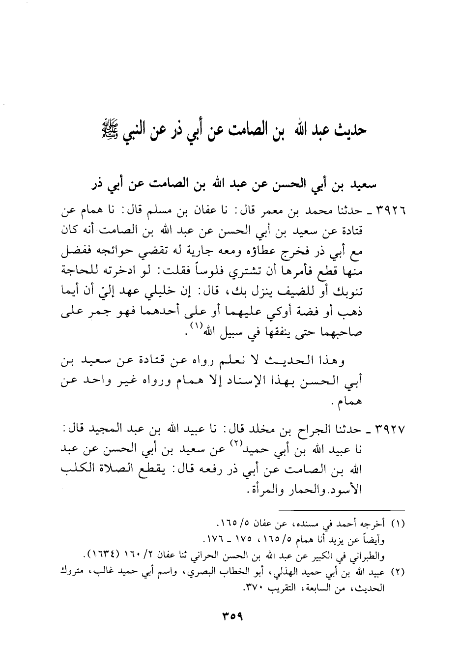 3926 - حَدَّثَنَا مُحَمَّدُ بْنُ مَعْمَرٍ، قَالَ: نَا عَفَّانُ بْنُ مُسْلِمٍ، قَالَ: نَا هَمَّامٌ، عَنْ قَتَادَةَ، عَنْ سَعِيدِ بْنِ أَبِي الْحَسَنِ، عَنْ عَبْدِ اللَّهِ بْنِ الصَّامِتِ، أَنَّهُ كَانَ مَعَ أَبِي ذَرٍّ فَخَرَجَ عَطَاؤُهُ وَمَعَهُ جَارِيَةٌ لَهُ تَقْضِي حَوَائِجَهُ فَفَضَلَ مِنْهَا قِطَعٌ فَأَمَرَهَا أَنْ تَشْتَرِيَ فُلُوسًا فَقُلْتُ: لَوِ ادَّخَرْتَهُ لِلْحَاجَةِ تَنُوبُكَ أَوْ لِلضَّيْفِ يَنْزِلُ بِكَ، قَالَ: إِنَّ خَلِيلِي عَهِدَ إِلَيَّ أَنْ §أَيُّمَا ذَهَبٍ أَوْ فِضَّةٍ أُوكِيَ عَلَيْهِمَا أَوْ عَلَى أَحَدِهِمَا فَهُوَ جَمْرٌ عَلَى صَاحِبِهِمَا حَتَّى يُنْفِقَهَا فِي سَبِيلِ اللَّهِ وَهَذَا الْحَدِيثُ لَا نَعْلَمُ رَوَاهُ عَنْ قَتَادَةَ، عَنْ سَعِيدِ بْنِ أَبِي الْحَسَنِ بِهَذَا الْإِسْنَادِ إِلَّا هَمَّامٌ وَرَوَاهُ غَيْرُ وَاحِدٍ، عَنْ هَمَّامٍ