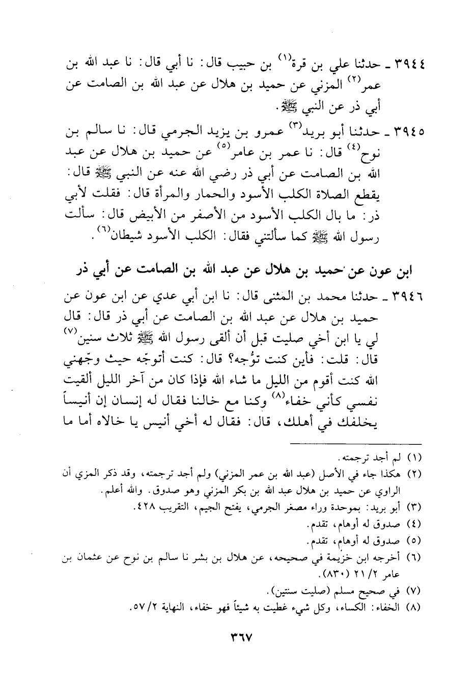 3946 - حَدَّثَنَا مُحَمَّدُ بْنُ الْمُثَنَّى، قَالَ: نَا ابْنُ أَبِي عَدِيٍّ، عَنِ ابْنِ عَوْنٍ، عَنْ حُمَيْدِ بْنِ هِلَالٍ، عَنْ عَبْدِ اللَّهِ بْنِ الصَّامِتِ، عَنْ أَبِي ذَرٍّ، قَالَ: قَالَ لِي: يَا ابْنَ أَخِي صَلَّيْتُ قَبْلَ أَنْ أَلْقَى رَسُولَ اللَّهِ صَلَّى اللهُ عَلَيْهِ وَسَلَّمَ ثَلَاثَ سِنِينَ، قَالَ: قُلْتُ: فَأَيْنَ كُنْتَ تَوَجَّهُ؟ قَالَ: كُنْتُ أَتَوَجَّهُ حَيْثُ وَجَّهَنِي اللَّهُ كُنْتُ أَقُومُ مِنَ اللَّيْلِ مَا شَاءَ اللَّهُ، فَإِذَا كَانَ مِنْ آخِرِ اللَّيْلِ أَلَقَيْتُ نَفْسِي كَأَنِّي خِفَاءٌ، وَكُنَّا مَعَ خَالِنَا فَقَالَ لَهُ إِنْسَانٌ: إِنَّ أُنَيْسًا يَخْلُفُكَ فِي أَهْلِكَ، قَالَ: فَقَالَ لَهُ: أَخِي أُنَيْسٌ يَا خَالَاهُ، أَمَا مَا -[368]- صَنَعْتَ مِنْ مَعْرُوفِكَ فَقَدْ وَاللَّهِ كَدَّرْتَهُ، وَأَمَّا نَحْنُ فَلَا نُسَاكِنُكَ بِبَلَدٍ أَنْتَ بِهِ، قَالَ: وَكُنَّا مَعَ أُمِّنَا فِي صِرْمَتِنَا فَنَافَرَ أَخِي أُنَيْسٌ رَجُلًا بِصِرْمَتِنَا فَتَنَافَرَ إِلَى رَجُلٍ مِنَ الْكُهَّانِ وَلَمْ يَزَلْ أُنَيْسًا يَمْدَحُهُ حَتَّى غَلَبَهُ فَأَخَذَ صِرْمَتَهُ فَضَمَّهَا إِلَى صِرْمَتِنَا وَانْطَلَقَ أَخِي أُنَيْسٌ إِلَى مَكَّةَ فَقَالَ: لَقَدْ رَأَيْتُ بِهَا رَجُلًا إِنَّهُ لَأَشْبَهُ النَّاسِ بِكَ يُقَالُ لَهُ الصَّابِئُ، قَالَ: قُلْتُ: حَتَّى أَذْهَبُ فَأَنْظُرُ، قَالَ: فَأَتَيْتُ مَكَّةَ فَدَنَوْتُ مِنْ إِنْسَانٍ فَقُلْتُ: أَيْنَ هَذَا الَّذِي يُقَالُ لَهُ الصَّابِئُ؟ قَالَ: فَرَفَعَ صَوْتَهُ، وَقَالَ: صَابِئٌ صَابِئٌ، قَالَ: فَرُمِيتُ حَتَّى تُرِكْتُ كَأَنِّي كَذَا كَلِمَةً ذَكَرَهَا ابْنُ أَبِي عَدِيٍّ فَانْطَلَقْتُ فَكُنْتُ بَيْنَ مَكَّةَ وَأَسْتَارِهَا فَخَرَجْتُ ذَاتَ لَيْلَةٍ، فَإِذَا أَنَا بِامْرَأَتَيْنِ تَطُوفَانِ تَدْعُوَانِ يَسَافًا وَنَائِلَةَ، قَالَ: قُلْتُ: زَوِّجُوا إِحْدَاهُمَا الْأُخْرَى، فَقَالَتَا: صَابِئٌ صَابِئٌ، قَالَ: قُلْتُ: أَنَا هُنُّ مِثْلُ خَشَبَةٍ فِي هُنَّ غَيْرَ أَنِّي مَا أُكَنَّى، قَالَ: فَانْطَلَقَتَا فَإِذَا هُمَا بِالنَّبِيِّ صَلَّى اللهُ عَلَيْهِ وَسَلَّمَ وَأَبِي بَكْرٍ مُقْبِلَيْنِ مِنْ أَسْفَلِ مَكَّةَ فَقَالَتَا: هَذَا صَابِئٌ بَيْنَ الْكَعْبَةِ وَأَسْتَارِهَا فَجَاءَ النَّبِيُّ صَلَّى اللهُ عَلَيْهِ وَسَلَّمَ فَطَافَ بِالْبَيْتِ وَصَلَّى رَكْعَتَيْنِ خَلْفَ الْمَقَامِ، قَالَ: فَأَتَيْتُهُ، قَالَ: فَإِنِّي أَوَّلُ النَّاسِ حَيَّاهُ بِتَحِيَّةِ الْإِسْلَامِ، قَالَ: قُلْتُ: السَّلَامُ عَلَيْكَ يَا رَسُولَ اللَّهِ: قَالَ: «وَعَلَيْكَ مَنْ أَنْتَ؟» قُلْتُ: أَنَا مِنْ بَنِي غِفَارٍ، قَالَ: فَقَالَ بِيَدِهِ كَذَا عَلَى وَجْهِهِ، قَالَ: قُلْتُ: كَرِهَ الْقَوْمَ الَّذِينَ انْتَمَيْتُ إِلَيْهِمْ -[369]- فذَهَبْتُ أَقُولُ بِيَدِهِ، قَالَ: فَقَالَ صَاحِبُهُ: بِيَدِهِ دُونَ يَدِي وَكَانَ أَعْلَمَ مِنِّي، قَالَ: فَرَفَعَ يَدَهُ، فَقَالَ: «مُنْذُ كَمْ أَنْتَ هَا هُنَا؟» قَالَ: قُلْتُ: مُنْذُ خَمْسَ عَشْرَةَ، قَالَ: «فَمَا كَانَ طَعَامُكَ؟» قُلْتُ: شَرَابُ زَمْزَمَ، وَمَا وَجَدْتَ عَلَى كَبِدِي سُخْفَةَ جُوعٍ، وَلَقَدْ تَكَسَّرَتْ عُكَنُ بَطْنِي، قَالَ: «أَمَا §إِنَّهُ طَعَامٌ طُعْمٍ وَشِفَاءُ سَقَمٍ» قَالَ: فَقَالَ أَبُو بَكْرٍ: مَتِّعْنِي بِضِيَافَةِ اللَّيْلَةِ، قَالَ: فَانْطَلَقَ بِي إِلَى دَارٍ فِي أَسْفَلَ مَكَّةَ فَقَبَضَ لِي قَبَضَاتٍ مِنْ زَبِيبٍ، قَالَ: وَقَالَ لِي رَسُولُ اللَّهِ صَلَّى اللهُ عَلَيْهِ وَسَلَّمَ: إِنَّهُ قَدْ ذُكِرَ لِي أَرْضٌ بِهَا نَخْلٌ فَإِذَا بَلَغَكَ أَنَّا قَدْ أَتَيْنَاهَا فَأْتِنَا، قَالَ: فَرَجَعْتُ إِلَى أَهْلِي فَقَالَ: أُنَيْسٌ مَا صَنَعْتَ؟ قُلْتُ: بَايَعْتُ رَسُولَ اللَّهِ صَلَّى ا