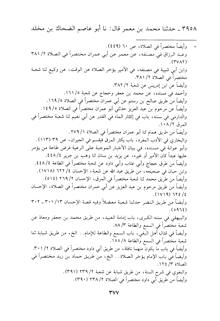 3959 - وَحَدَّثَنَا أَبُو مُوسَى، قَالَ: نَا مَرْحُومُ بْنُ عَبْدِ الْعَزِيزِ، قَالَ: نَا أَبُو عِمْرَانَ الْجَوْنِيُّ، عَنْ عَبْدِ اللَّهِ بْنِ الصَّامِتِ، عَنْ أَبِي ذَرٍّ، رَضِيَ اللَّهُ عَنْهُ، عَنِ النَّبِيِّ صَلَّى اللهُ عَلَيْهِ وَسَلَّمَ أَنَّهُ، قَالَ: «كَيْفَ تَصْنَعُ إِذَا بَلَغَ بِكَ الْجَهْدُ أَنْ لَا يَسْتَطِيعَ الرَّجُلُ أَنْ يَقُومَ إِلَى فِرَاشِهِ مِنَ الْجَهْدِ» قَالَ: قُلْتُ: اللَّهُ وَرَسُولُهُ أَعْلَمُ، قَالَ: «تَسْتَعِفُّ» ، قَالَ: «يَا أَبَا ذَرٍّ كَيْفَ تَصْنَعُ إِذَا كَثُرَ الْمَوْتُ حَتَّى يُبَاعَ الْبَيْتُ بِالْعَبْدِ» قَالَ: قُلْتُ: لِأَبِي عِمْرَانَ مَا الْبَيْتُ؟ قَالَ: الْقَبْرُ، قَالَ: قُلْتُ: اللَّهُ وَرَسُولُهُ أَعْلَمُ، قَالَ: «فَاصْبِرْ أَوْ تَصْبِرُ» قَالَ: " يَا أَبَا ذَرٍّ كَيْفَ تَصْنَعُ إِذَا كَثُرَ الْقَتْلُ حَتَّى يُغْرَقَ حِجَارَةُ الزَّيْتِ بِالدَّمِ، قُلْتُ: اللَّهُ وَرَسُولُهُ أَعْلَمُ، قَالَ: تَجْلِسُ فِي بَيْتِكَ، قُلْتُ: فَإِنْ لَمْ أَتْرُكْ، قَالَ: «تَلْحَقُ بِمَنْ أَنْتَ مِنْهُ» ، قُلْتُ: فَأَحْمِلُ مَعِي السِّلَاحَ، قَالَ: «قَدْ شَرِكْتَ الْقَوْمَ إِذًا» قَالَ: قُلْتُ: فَكَيْفَ أَصْنَعُ؟ قَالَ: «§إِنْ خَشِيتَ أَنْ يَبْهَرَكَ شُعَاعُ السَّيْفِ فَخُذْ بِنَاحِيَةِ ثَوْبِكَ فَأَلْقِهِ عَلَى وَجْهِكَ يَبُوءُ بِإِثْمِكَ وَإِثْمِهِ» -[379]- وَهَذَا الْحَدِيثُ رَوَاهُ جَمَاعَةٌ، عَنْ أَبِي عِمْرَانَ، عَنْ عَبْدِ اللَّهِ بْنِ الصَّامِتِ، عَنْ أَبِي ذَرٍّ إِلَّا حَمَّادُ بْنُ زَيْدٍ فَرَوَاهُ عَنْ أَبِي عِمْرَانَ، عَنِ الْمُشَعَّثِ بْنِ طَرِيفٍ، عَنْ عَبْدِ اللَّهِ بْنِ الصَّامِتِ، عَنْ أَبِي ذَرٍّ
