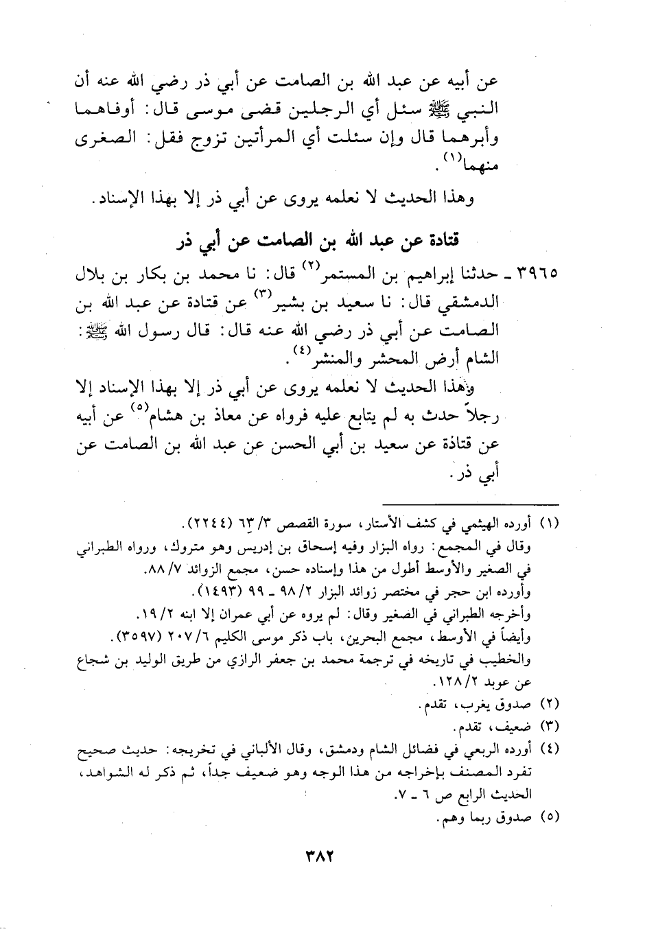 3965 - حَدَّثَنَا إِبْرَاهِيمُ بْنُ الْمُسْتَمِرِّ، قَالَ: نَا مُحَمَّدُ بْنُ بَكَّارِ بْنِ بِلَالٍ الدِّمَشْقِيُّ، قَالَ: نَا سَعِيدُ بْنُ بَشِيرٍ، عَنْ قَتَادَةَ، عَنْ عَبْدِ اللَّهِ بْنِ الصَّامِتِ، عَنْ أَبِي ذَرٍّ، رَضِيَ اللَّهُ عَنْهُ، قَالَ: قَالَ رَسُولُ اللَّهِ صَلَّى اللهُ عَلَيْهِ وَسَلَّمَ: «§الشَّامُ أَرْضُ الْمَحْشَرِ وَالْمَنْشَرِ» وَهَذَا الْحَدِيثُ لَا نَعْلَمُهُ يُرْوَى عَنْ أَبِي ذَرٍّ إِلَّا بِهَذَا الْإِسْنَادِ إِلَّا رَجُلًا حَدَّثَ بِهِ لَمْ يُتَابِعْ عَلَيْهِ فَرَوَاهُ عَنْ مُعَاذِ بْنِ هِشَامٍ، عَنْ أَبِيهِ، عَنْ قَتَادَةَ، عَنْ سَعِيدِ بْنِ أَبِي الْحَسَنِ، عَنْ عَبْدِ اللَّهِ بْنِ الصَّامِتِ، عَنْ أَبِي ذَرٍّ