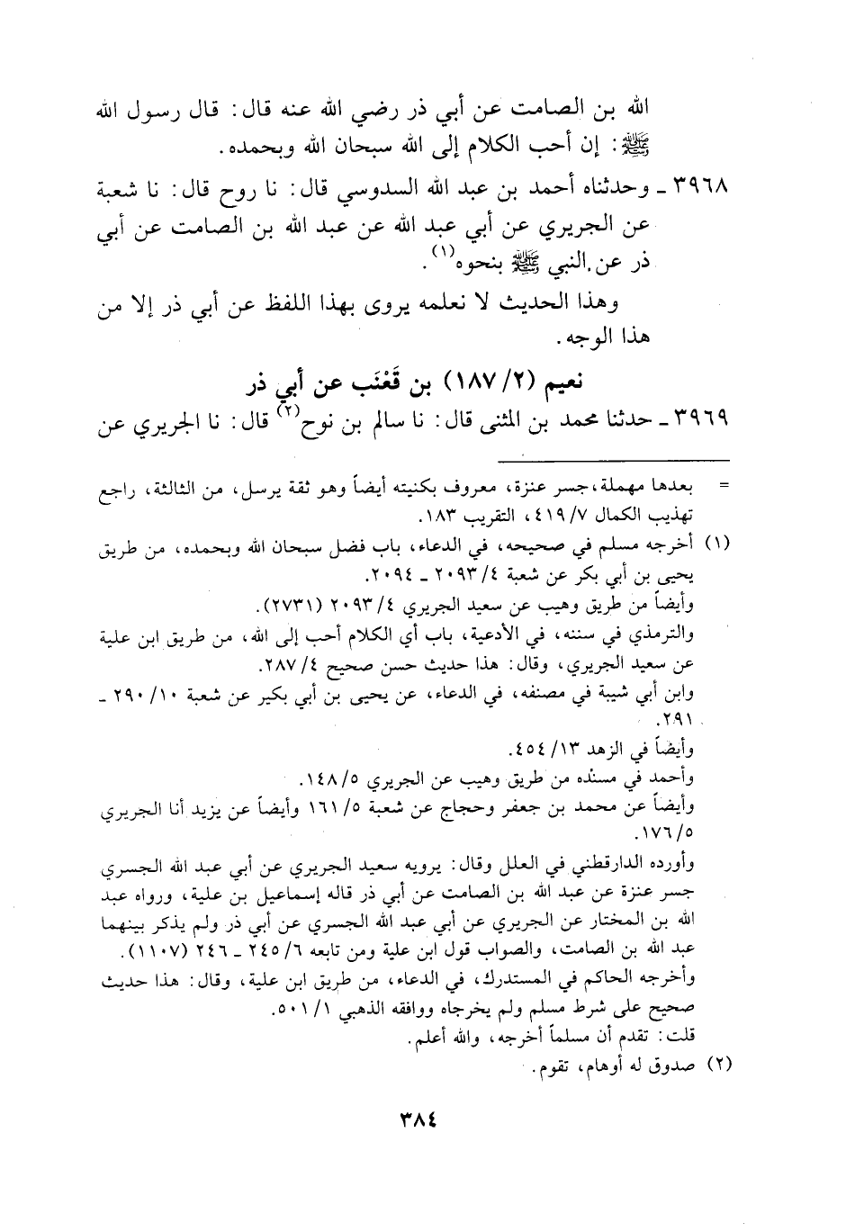 3969 - حَدَّثَنَا مُحَمَّدُ بْنُ الْمُثَنَّى، قَالَ: نَا سَالِمُ بْنُ نُوحٍ، قَالَ: نَا الْجُرَيْرِيُّ، عَنْ -[385]- أَبِي الْعَلَاءِ، عَنْ نُعَيْمِ بْنِ قَعْنَبٍ، عَنْ أَبِي ذَرٍّ، عَنِ النَّبِيِّ صَلَّى اللهُ عَلَيْهِ وَسَلَّمَ