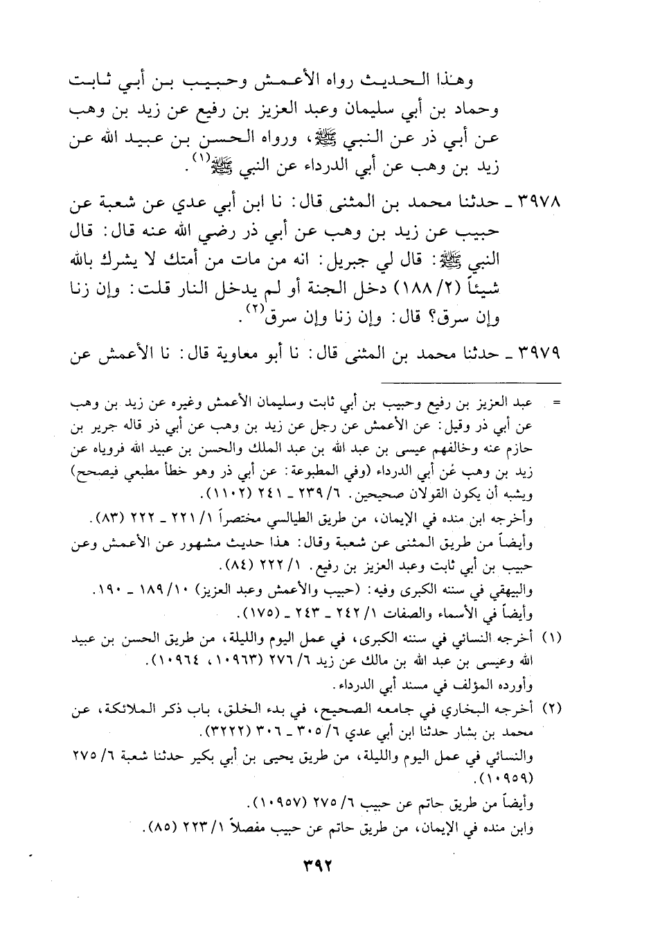 3978 - حَدَّثَنَا مُحَمَّدُ بْنُ الْمُثَنَّى، قَالَ: نَا ابْنُ أَبِي عَدِيٍّ، عَنْ شُعْبَةَ، عَنْ حَبِيبٍ، عَنْ زَيْدِ بْنِ وَهْبٍ، عَنْ أَبِي ذَرٍّ، رَضِيَ اللَّهُ عَنْهُ، قَالَ: قَالَ النَّبِيُّ صَلَّى اللهُ عَلَيْهِ وَسَلَّمَ، قَالَ لِي جِبْرِيلُ: " إِنَّهُ §مَنْ مَاتَ مِنْ أُمَّتِكَ لَا يُشْرِكُ بِاللَّهِ شَيْئًا دَخَلَ الْجَنَّةَ أَوْ لَمْ يَدْخُلِ النَّارَ، قُلْتُ: وَإِنْ زِنَى وَإِنْ سَرَقَ، قَالَ: «وَإِنْ زَنَى وَإِنْ سَرَقَ»
