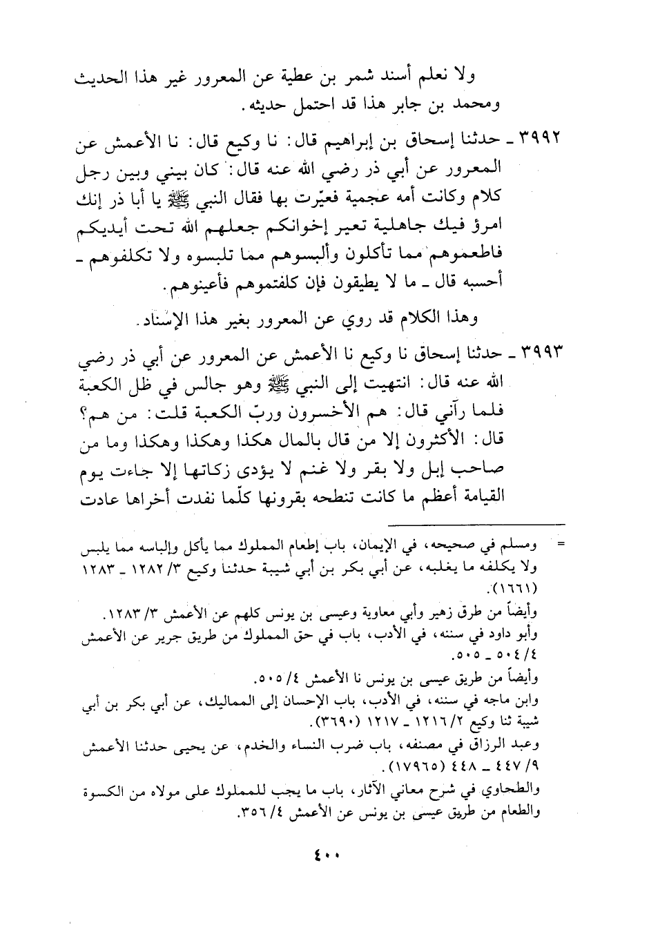 3993 - حَدَّثَنَا إِسْحَاقُ، نَا وَكِيعٌ، نَا الْأَعْمَشُ، عَنِ الْمَعْرُورِ، عَنْ أَبِي ذَرٍّ، رَضِيَ اللَّهُ عَنْهُ، قَالَ: انْتَهَيْتُ إِلَى النَّبِيِّ صَلَّى اللهُ عَلَيْهِ وَسَلَّمَ وَهُوَ جَالِسٌ فِي ظِلِّ الْكَعْبَةِ فَلَمَّا رَآنِي، قَالَ: «§هُمُ الْأَخْسَرُونَ وَرَبِّ الْكَعْبَةِ» قُلْتُ: مَنْ هُمْ؟ قَالَ: «الْأَكْثَرُونَ إِلَّا مَنْ قَالَ بِالْمَالِ هَكَذَا وَهَكَذَا وَهَكَذَا، وَمَا مِنْ صَاحِبِ إِبِلٍ وَلَا بَقَرٍ وَلَا غَنَمٍ لَا يُؤَدَّى زَكَاتَهَا إِلَّا جَاءَتْ يَوْمَ الْقِيَامَةِ أَعْظَمَ مَا كَانَتْ تَنْطَحُهُ بِقُرُونِهَا كُلَّمَا نَفِدَتْ أُخْرَاهَا عَادَتْ -[401]- عَلَيْهِ أُولَاهَا حَتَّى يَقْضِيَ بَيْنَ النَّاسِ»