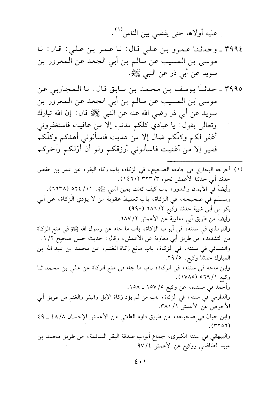 3994 - وَحَدَّثَنَا عَمْرُو بْنُ عَلِيٍّ، قَالَ: نَا عُمَرُ بْنُ عَلِيٍّ، قَالَ: نَا مُوسَى بْنُ الْمُسَيَّبِ، عَنْ سَالِمِ بْنِ أَبِي الْجَعْدِ، عَنِ الْمَعْرُورِ بْنِ سُوَيْدٍ، عَنْ أَبِي ذَرٍّ، عَنِ النَّبِيِّ صَلَّى اللهُ عَلَيْهِ وَسَلَّمَ