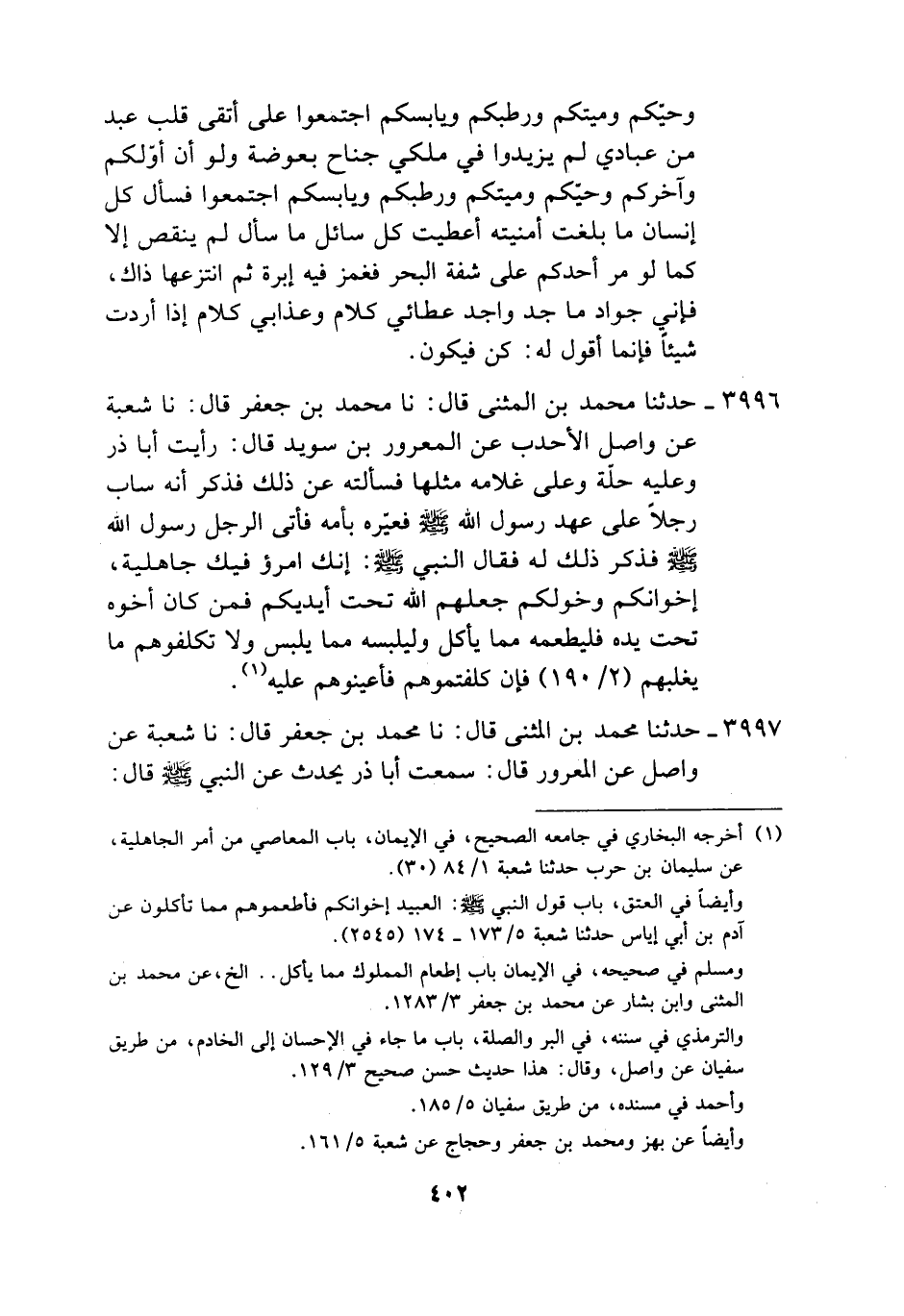 3996 - حَدَّثَنَا مُحَمَّدُ بْنُ الْمُثَنَّى، قَالَ: نَا مُحَمَّدُ بْنُ جَعْفَرٍ، قَالَ: نَا شُعْبَةُ، عَنْ وَاصِلٍ الْأَحْدَبِ، عَنِ الْمَعْرُورِ بْنِ سُوَيْدٍ، قَالَ: رَأَيْتُ أَبَا ذَرٍّ وَعَلَيْهِ حُلَّةٌ وَعَلَى غُلَامِهِ مِثْلُهَا فَسَأَلْتُهُ عَنْ ذَلِكَ فَذَكَرَ أَنَّهُ سَابَّ رَجُلًا عَلَى عَهْدِ رَسُولِ اللَّهِ صَلَّى اللهُ عَلَيْهِ وَسَلَّمَ: فَعَيَّرَهُ بِأُمِّهِ فَأَتَى الرَّجُلُ رَسُولَ اللَّهِ صَلَّى اللهُ عَلَيْهِ وَسَلَّمَ: فَذَكَرَ ذَلِكَ لَهُ فَقَالَ النَّبِيُّ صَلَّى اللهُ عَلَيْهِ وَسَلَّمَ: «§إِنَّكَ امْرُؤ فِيكَ جَاهِلِيَّةٌ إِخْوَانُكُمْ وَخَوَلُكُمْ جَعَلَهُمُ اللَّهُ تَحْتَ أَيْدِيكُمْ، فَمَنْ كَانَ أَخُوهُ تَحْتَ يَدِهِ فَلْيُطْعِمْهُ مِمَّا يَأْكُلُ وَلْيُلْبِسْهُ مِمَّا يَلْبَسُ وَلَا تُكَلِّفُوهُمْ مَا يَغْلِبُهُمْ، فَإِنْ كَلَّفْتُمُوهُمْ فَأَعِينُوهُمْ عَلَيْهِ»