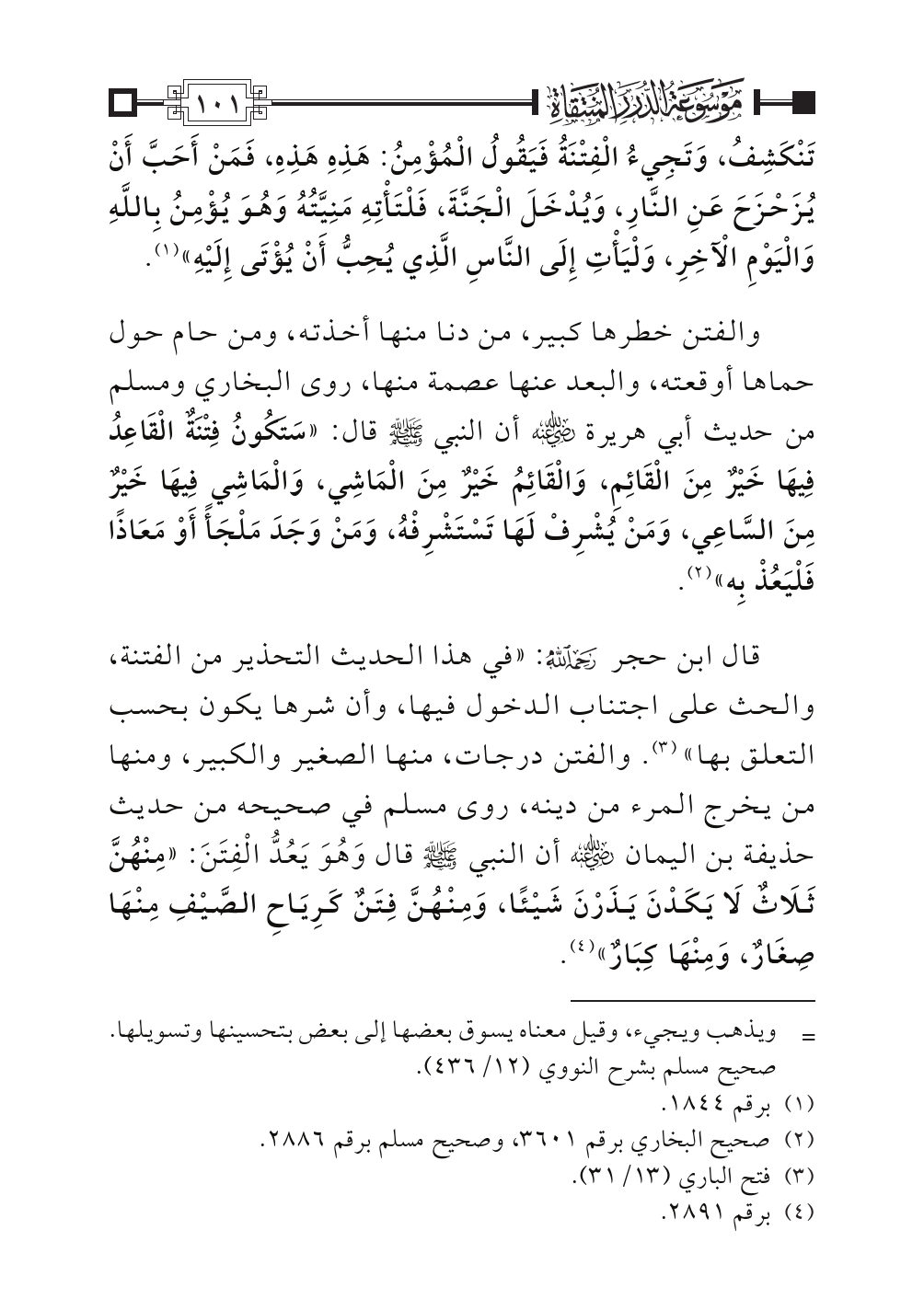 والفتن خطرها كبير، من دنا منها أخذته، ومن حام حول حماها أوقعته، والبعد عنها عصمة منها، روى البخاري ومسلم من حديث أبي هريرة -رضي الله عنه- أن النبي -صلى الله عليه وسلم- قال: «سَتَكُونُ فِتْنَةٌ الْقَاعِدُ فِيهَا خَيْرٌ مِنَ الْقَائِمِ، وَالْقَائِمُ خَيْرٌ مِنَ الْمَاشِي، وَالْمَاشِي فِيهَا خَيْرٌ مِنَ السَّاعِي، وَمَنْ يُشْرِفْ لَهَا تَسْتَشْرِفْهُ، وَمَنْ وَجَدَ مَلْجَأً أَوْ مَعَاذًا فَلْيَعُذْ بِه» (¬٢).