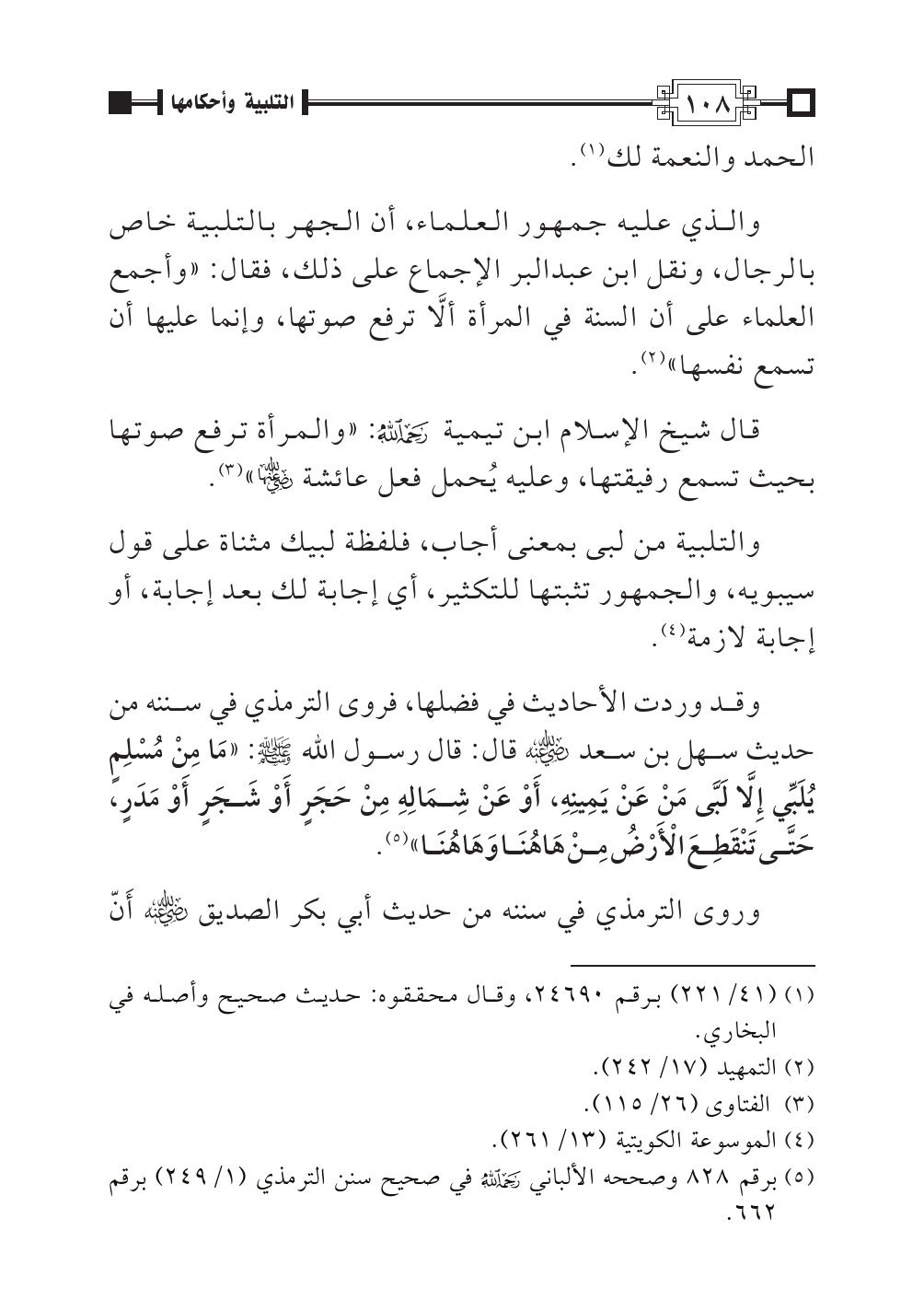 وقد وردت الأحاديث في فضلها، فروى الترمذي في سننه من حديث سهل بن سعد -رضي الله عنه- قال: قال رسول الله -صلى الله عليه وسلم-: «مَا مِنْ مُسْلِمٍ يُلَبِّي إِلَّا لَبَّى مَنْ عَنْ يَمِينِهِ، أَوْ عَنْ شِمَالِهِ مِنْ حَجَرٍ أَوْ شَجَرٍ أَوْ مَدَرٍ، حَتَّى تَنْقَطِعَ الْأَرْضُ مِنْ هَاهُنَا وَهَاهُنَا» (¬٥).