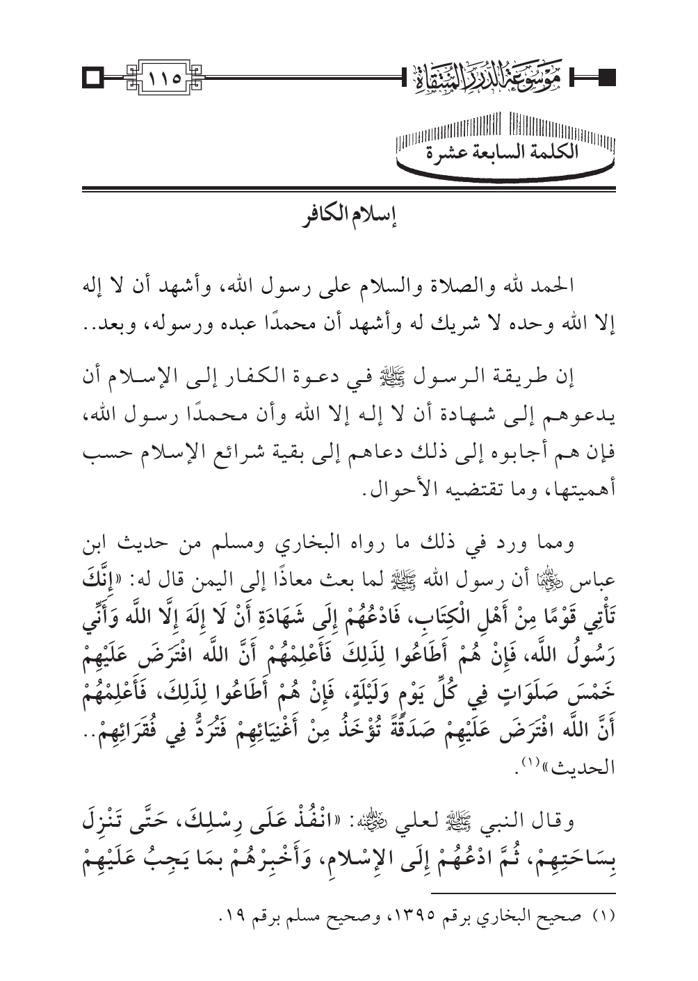 إن طريقة الرسول -صلى الله عليه وسلم- في دعوة الكفار إلى الإسلام أن يدعوهم إلى شهادة أن لا إله إلا الله وأن محمدًا رسول الله، فإن هم أجابوه إلى ذلك دعاهم إلى بقية شرائع الإسلام حسب أهميتها، وما تقتضيه الأحوال.