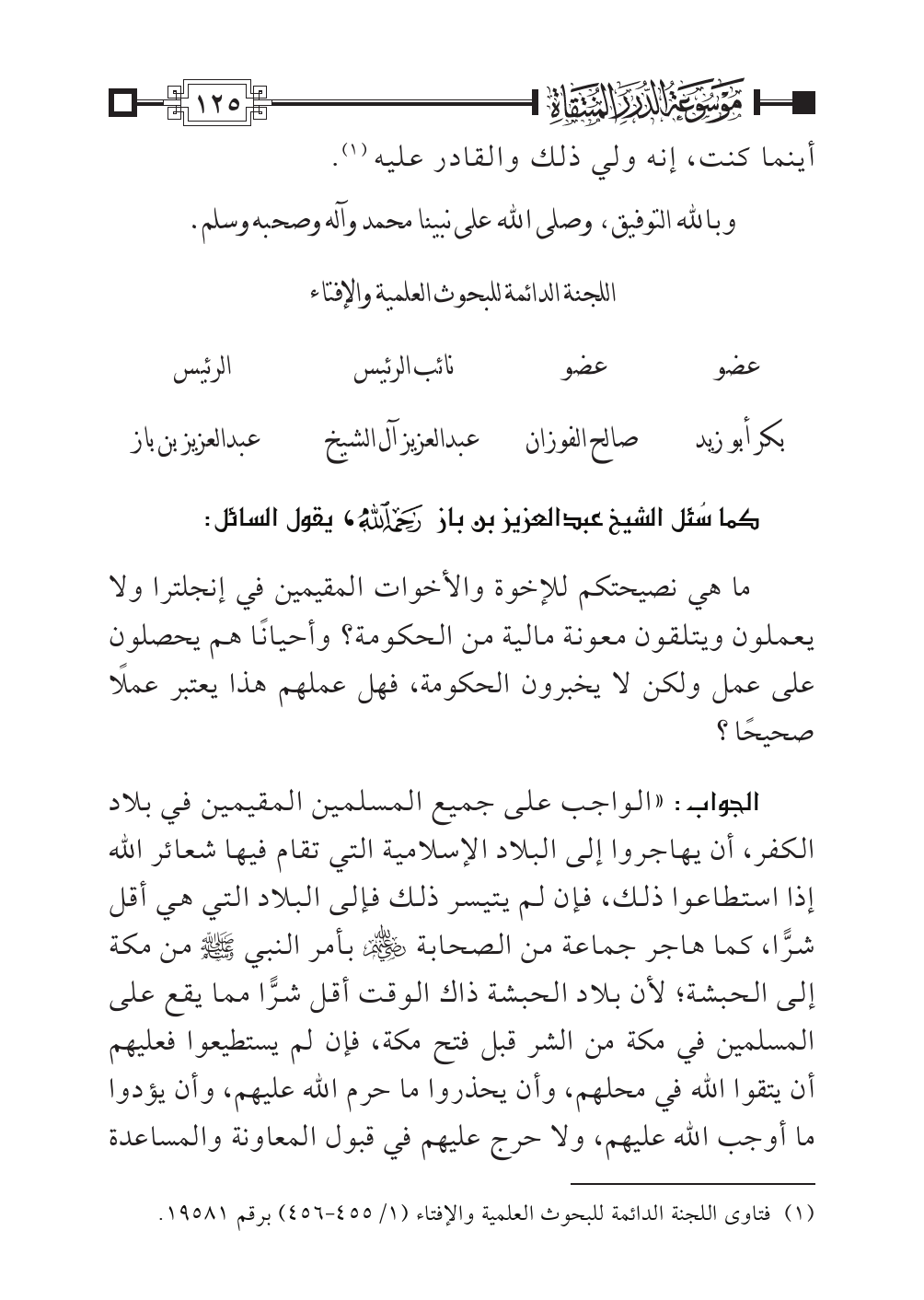 الجواب: «الواجب على جميع المسلمين المقيمين في بلاد الكفر، أن يهاجروا إلى البلاد الإسلامية التي تقام فيها شعائر الله إذا استطاعوا ذلك، فإن لم يتيسر ذلك فإلى البلاد التي هي أقل شرًّا، كما هاجر جماعة من الصحابة -رضي الله عنهم- بأمر النبي -صلى الله عليه وسلم- من مكة إلى الحبشة؛ لأن بلاد الحبشة ذاك الوقت أقل شرًّا مما يقع على المسلمين في مكة من الشر قبل فتح مكة، فإن لم يستطيعوا فعليهم أن يتقوا الله في محلهم، وأن يحذروا ما حرم الله عليهم، وأن يؤدوا ما أوجب الله عليهم، ولا حرج عليهم في قبول المعاونة والمساعدة