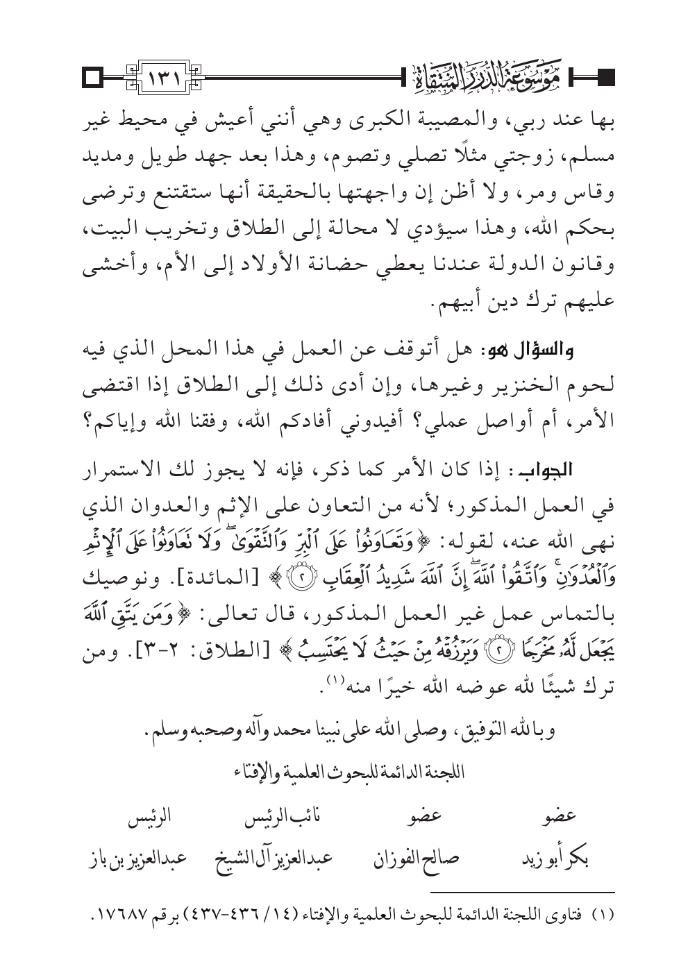 والسؤال هو: هل أتوقف عن العمل في هذا المحل الذي فيه لحوم الخنزير وغيرها، وإن أدى ذلك إلى الطلاق إذا اقتضى الأمر، أم أواصل عملي؟ أفيدوني أفادكم الله، وفقنا الله وإياكم؟