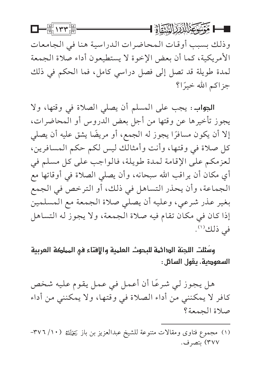 الجواب: يجب على المسلم أن يصلي الصلاة في وقتها، ولا يجوز تأخيرها عن وقتها من أجل بعض الدروس أو المحاضرات، إلا أن يكون مسافرًا يجوز له الجمع، أو مريضًا يشق عليه أن يصلي كل صلاة في وقتها، وأنت وأمثالك ليس لكم حكم المسافرين، لعزمكم على الإقامة لمدة طويلة، فالواجب على كل مسلم في أي مكان أن يراقب الله سبحانه، وأن يصلي الصلاة في أوقاتها مع الجماعة، وأن يحذر التساهل في ذلك، أو الترخص في الجمع بغير عذر شرعي، وعليه أن يصلي صلاة الجمعة مع المسلمين إذا كان في مكان تقام فيه صلاة الجمعة، ولا يجوز له التساهل في ذلك (¬١).