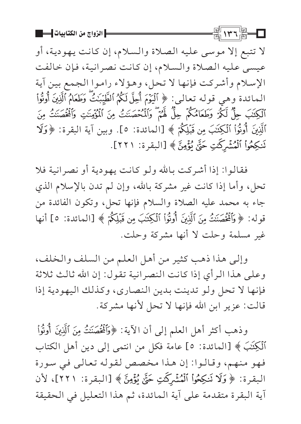 وذهب أكثر أهل العلم إلى أن الآية: {وَالْمُحْصَنَاتُ مِنَ الَّذِينَ أُوتُوا الْكِتَابَ} [المائدة: ٥] عامة فكل من انتمى إلى دين أهل الكتاب فهو منهم، وقالوا: إن هذا مخصص لقوله تعالى في سورة البقرة: {وَلَا تَنْكِحُوا الْمُشْرِكَاتِ حَتَّى يُؤْمِنَّ} [البقرة: ٢٢١]، لأن آية البقرة متقدمة على آية المائدة، ثم هذا التعليل في الحقيقة