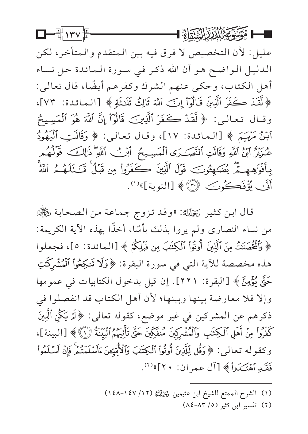 عليل: لأن التخصيص لا فرق فيه بين المتقدم والمتأخر، لكن الدليل الواضح هو أن الله ذكر في سورة المائدة حل نساء أهل الكتاب، وحكى عنهم الشرك وكفرهم أيضًا، قال تعالى: {لَقَدْ كَفَرَ الَّذِينَ قَالُوا إِنَّ اللَّهَ ثَالِثُ ثَلَاثَةٍ} [المائدة: ٧٣]، وقال تعالى: {لَقَدْ كَفَرَ الَّذِينَ قَالُوا إِنَّ اللَّهَ هُوَ الْمَسِيحُ ابْنُ مَرْيَمَ} [المائدة: ١٧]، وقال تعالى: {وَقَالَتِ الْيَهُودُ عُزَيْرٌ ابْنُ اللَّهِ وَقَالَتِ النَّصَارَى الْمَسِيحُ ابْنُ اللَّهِ ذَلِكَ قَوْلُهُمْ بِأَفْوَاهِهِمْ يُضَاهِئُونَ قَوْلَ الَّذِينَ كَفَرُوا مِنْ قَبْلُ قَاتَلَهُمُ اللَّهُ أَنَّى يُؤْفَكُونَ (٣٠)} [التوبة]» (¬١).