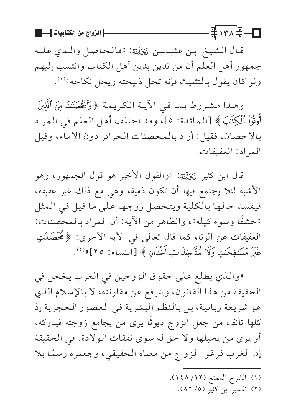وهذا مشروط بما في الآية الكريمة {وَالْمُحْصَنَاتُ مِنَ الَّذِينَ أُوتُوا الْكِتَابَ} [المائدة: ٥]، وقد اختلف أهل العلم في المراد بالإحصان، فقيل: أراد بالمحصنات الحرائر دون الإماء، وقيل المراد: العفيفات.