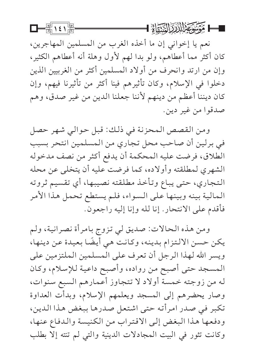 ومن القصص المحزنة في ذلك: قبل حوالي شهر حصل في برلين أن صاحب محل تجاري من المسلمين انتحر بسبب الطلاق، فرضت عليه المحكمة أن يدفع أكثر من نصف مدخوله الشهري لمطلقته وأولاده، كما فرضت عليه أن يتخلى عن محله التجاري، حتى يباع وتأخذ مطلقته نصيبها، أي تقسيم ثروته المالية بينه وبينها على السواء، فلم يستطع تحمل هذا الأمر فأقدم على الانتحار. إنا لله وإنا إليه راجعون.