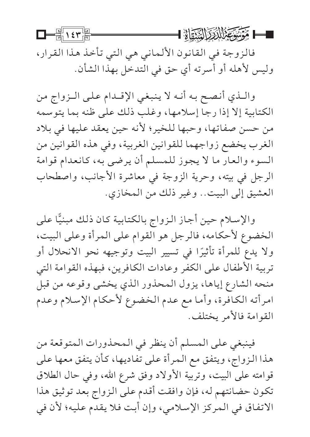 والذي أنصح به أنه لا ينبغي الإقدام على الزواج من الكتابية إلا إذا رجا إسلامها، وغلب ذلك على ظنه بما يتوسمه من حسن صفاتها، وحبها للخير؛ لأنه حين يعقد عليها في بلاد الغرب يخضع زواجهما للقوانين الغربية، وفي هذه القوانين من السوء والعار ما لا يجوز للمسلم أن يرضى به، كانعدام قوامة الرجل في بيته، وحرية الزوجة في معاشرة الأجانب، واصطحاب العشيق إلى البيت .. وغير ذلك من المخازي.