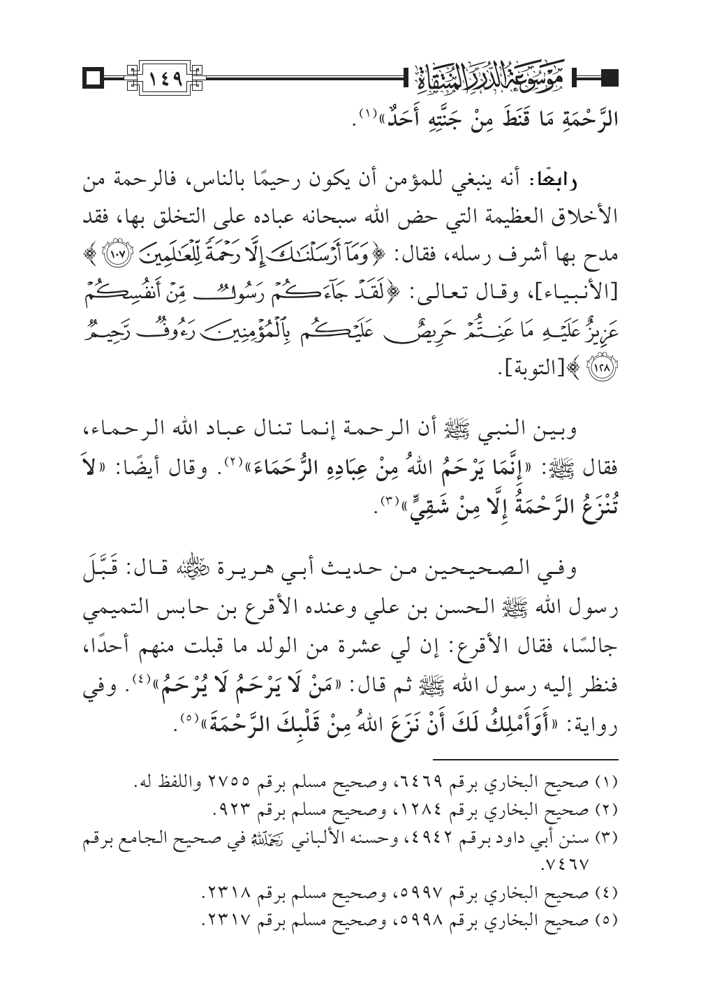 وبين النبي -صلى الله عليه وسلم- أن الرحمة إنما تنال عباد الله الرحماء، فقال -صلى الله عليه وسلم-: «إِنَّمَا يَرْحَمُ اللهُ مِنْ عِبَادِهِ الرُّحَمَاءَ» (¬٢). وقال أيضًا: «لَا تُنْزَعُ الرَّحْمَةُ إِلَّا مِنْ شَقِيٍّ» (¬٣).