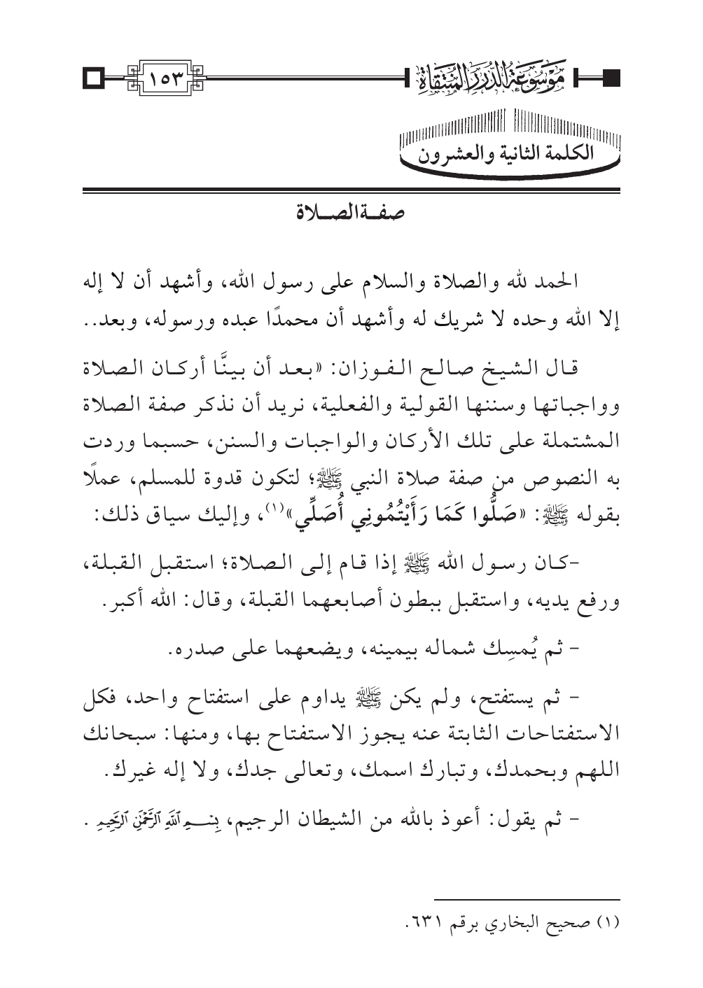 قال الشيخ صالح الفوزان: «بعد أن بينَّا أركان الصلاة وواجباتها وسننها القولية والفعلية، نريد أن نذكر صفة الصلاة المشتملة على تلك الأركان والواجبات والسنن، حسبما وردت به النصوص من صفة صلاة النبي -صلى الله عليه وسلم-؛ لتكون قدوة للمسلم، عملًا بقوله -صلى الله عليه وسلم-: «صَلُّوا كَمَا رَأَيْتُمُونِي أُصَلِّي» (¬١)، وإليك سياق ذلك: