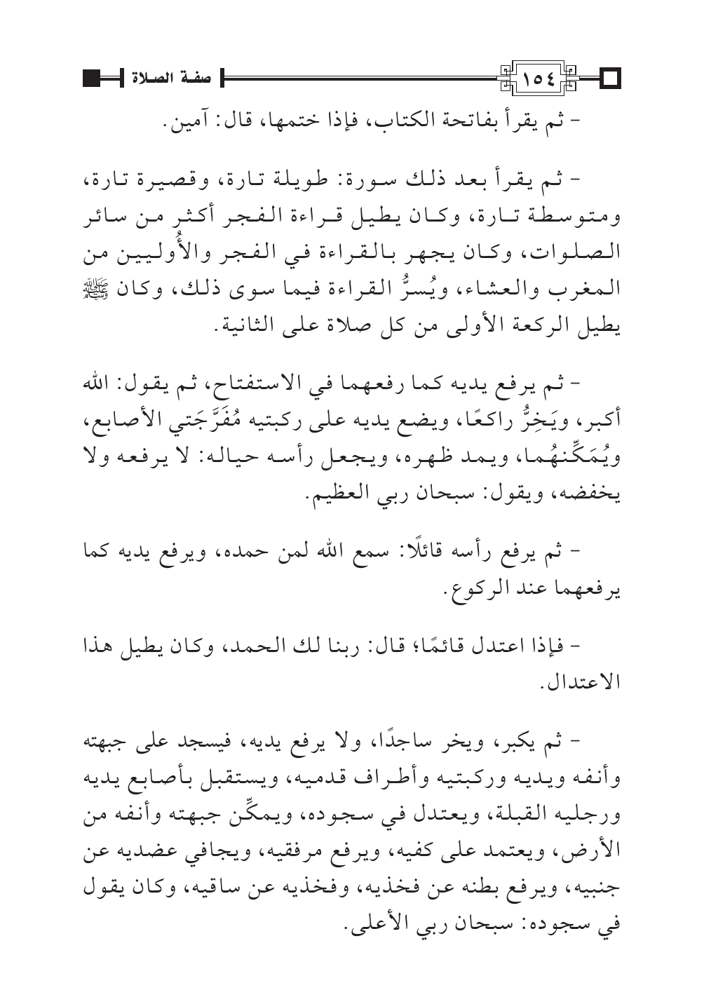 - ثم يكبر، ويخر ساجدًا، ولا يرفع يديه، فيسجد على جبهته وأنفه ويديه وركبتيه وأطراف قدميه، ويستقبل بأصابع يديه ورجليه القبلة، ويعتدل في سجوده، ويمكِّن جبهته وأنفه من الأرض، ويعتمد على كفيه، ويرفع مرفقيه، ويجافي عضديه عن جنبيه، ويرفع بطنه عن فخذيه، وفخذيه عن ساقيه، وكان يقول في سجوده: سبحان ربي الأعلى.
