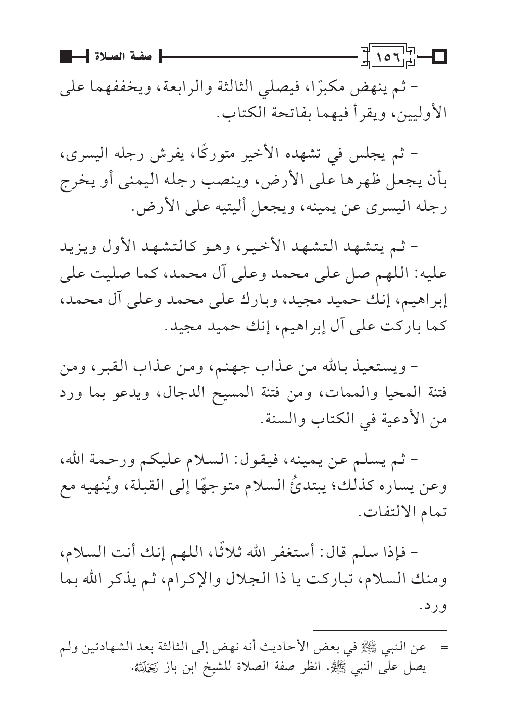 - ثم ينهض مكبرًا، فيصلي الثالثة والرابعة، ويخففهما على الأوليين، ويقرأ فيهما بفاتحة الكتاب.