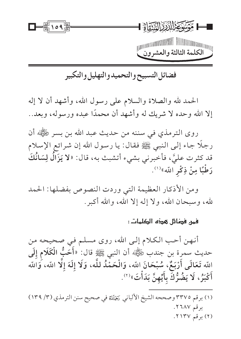 أنهن أحب الكلام إلى الله، روى مسلم في صحيحه من حديث سمرة بن جندب -رضي الله عنه- أن النبي -صلى الله عليه وسلم- قال: «أَحَبُّ الْكَلَامِ إِلَى الله تَعَالَى أَرْبَعٌ، سُبْحَانَ الله، وَالْحَمْدُ للَّه، وَلَا إِلَهَ إِلَّا الله، وَالله أَكْبَرُ، لَا يَضُرُّكَ بِأَيِّهِنَّ بَدَأْتَ» (¬٢).