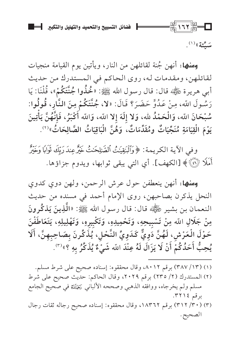 ومنها: أنهن جُنة لقائلهن من النار، ويأتين يوم القيامة منجيات لقائلهن، ومقدمات له، روى الحاكم في المستدرك من حديث أبي هريرة -رضي الله عنه- قال: قال رسول الله -صلى الله عليه وسلم-: «خُذُوا جُنَّتَكُمْ»، قُلْنَا: يَا رَسُولَ الله، مِنْ عَدُوٍّ حَضَرَ؟ قَالَ: «لا، جُنَّتَكُمْ مِنَ النَّارِ، قُولُوا: سُبْحَانَ الله، وَالْحَمْدُ لله، وَلا إِلَهَ إِلا الله، وَالله أَكْبَرُ، فَإِنَّهُنَّ يَأْتِينَ يَوْمَ الْقِيَامَةِ مُنَجِّيَاتٌ ومُقَدِّمَاتٌ، وَهُنَّ الْبَاقِيَاتُ الصَّالِحَاتُ» (¬٢).