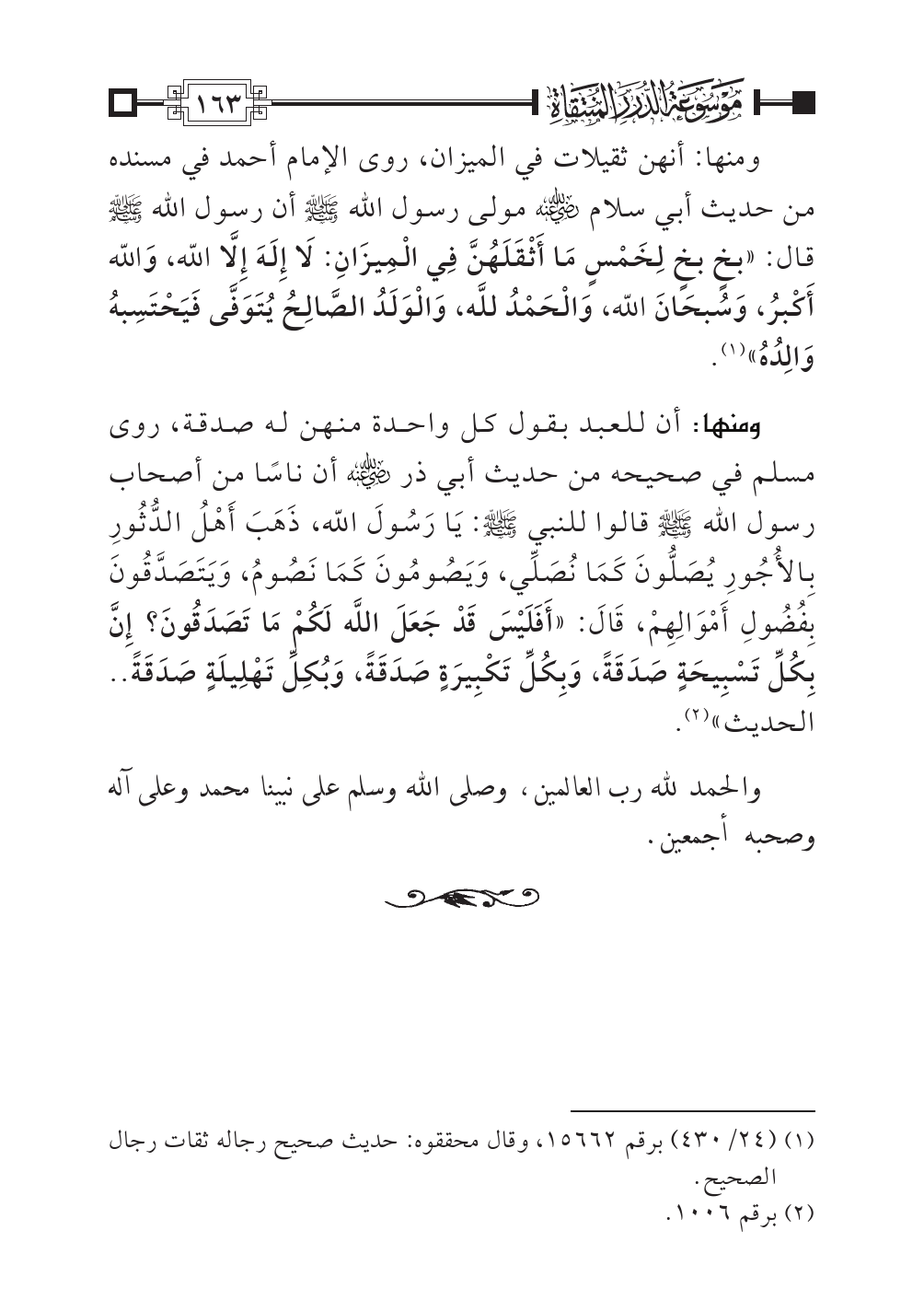 ومنها: أنهن ثقيلات في الميزان، روى الإمام أحمد في مسنده من حديث أبي سلام -رضي الله عنه- مولى رسول الله -صلى الله عليه وسلم- أن رسول الله -صلى الله عليه وسلم- قال: «بخٍ بخٍ لِخَمْسٍ مَا أَثْقَلَهُنَّ فِي الْمِيزَانِ: لَا إِلَهَ إِلَّا الله، وَالله أَكْبرُ، وَسُبحَانَ الله، وَالْحَمْدُ للَّه، وَالْوَلَدُ الصَّالِحُ يُتَوَفَّى فَيَحْتَسِبهُ وَالِدُهُ» (¬١).