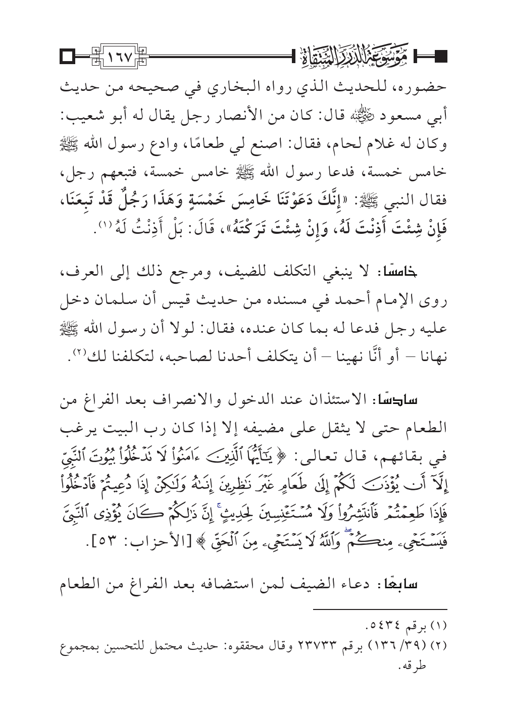 خامسًا: لا ينبغي التكلف للضيف، ومرجع ذلك إلى العرف، روى الإمام أحمد في مسنده من حديث قيس أن سلمان دخل عليه رجل فدعا له بما كان عنده، فقال: لولا أن رسول الله -صلى الله عليه وسلم- نهانا - أو أنَّا نهينا - أن يتكلف أحدنا لصاحبه، لتكلفنا لك (¬٢).