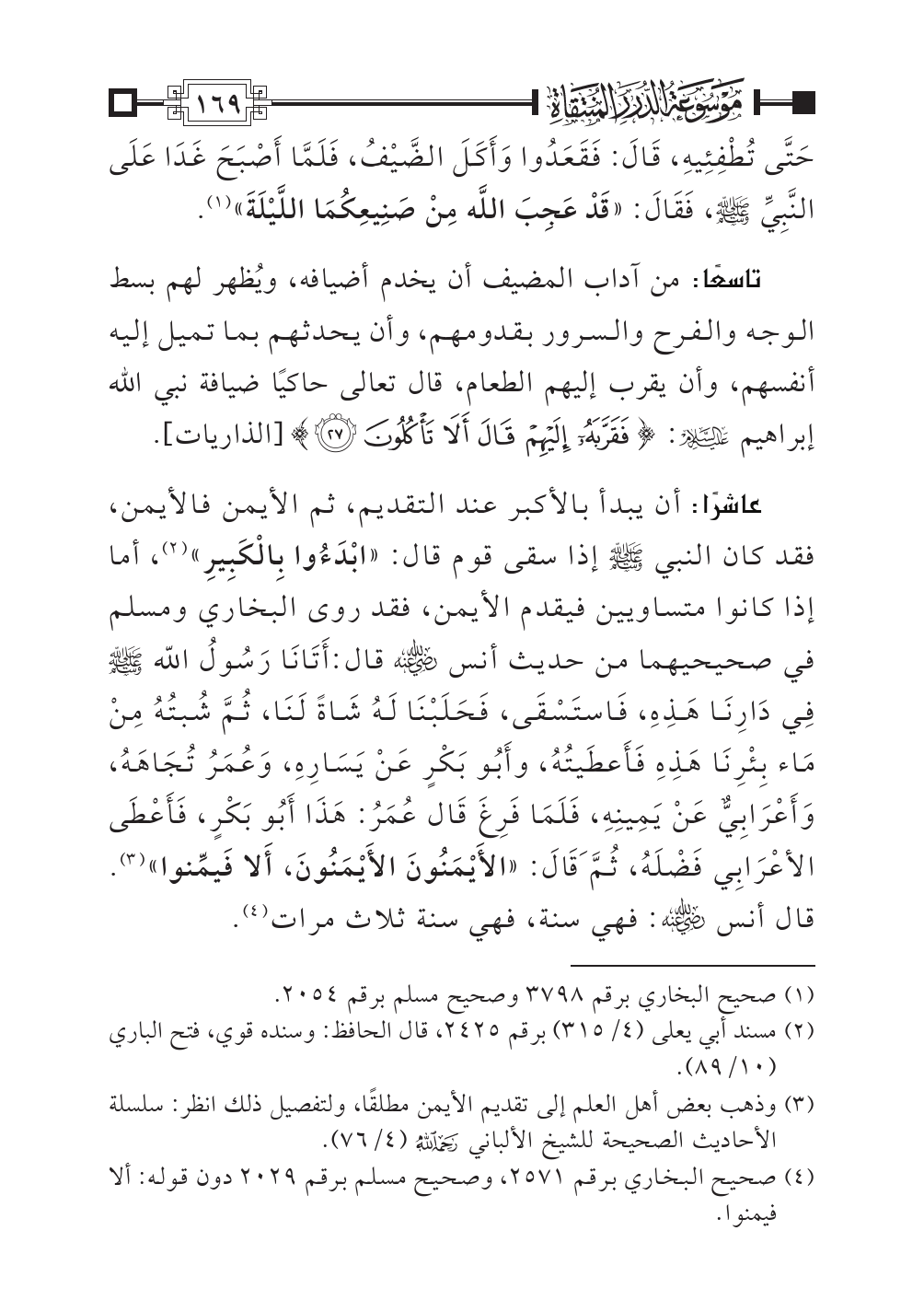 عاشرًا: أن يبدأ بالأكبر عند التقديم، ثم الأيمن فالأيمن، فقد كان النبي -صلى الله عليه وسلم- إذا سقى قوم قال: «ابْدَءُوا بِالْكَبِيرِ» (¬٢)،