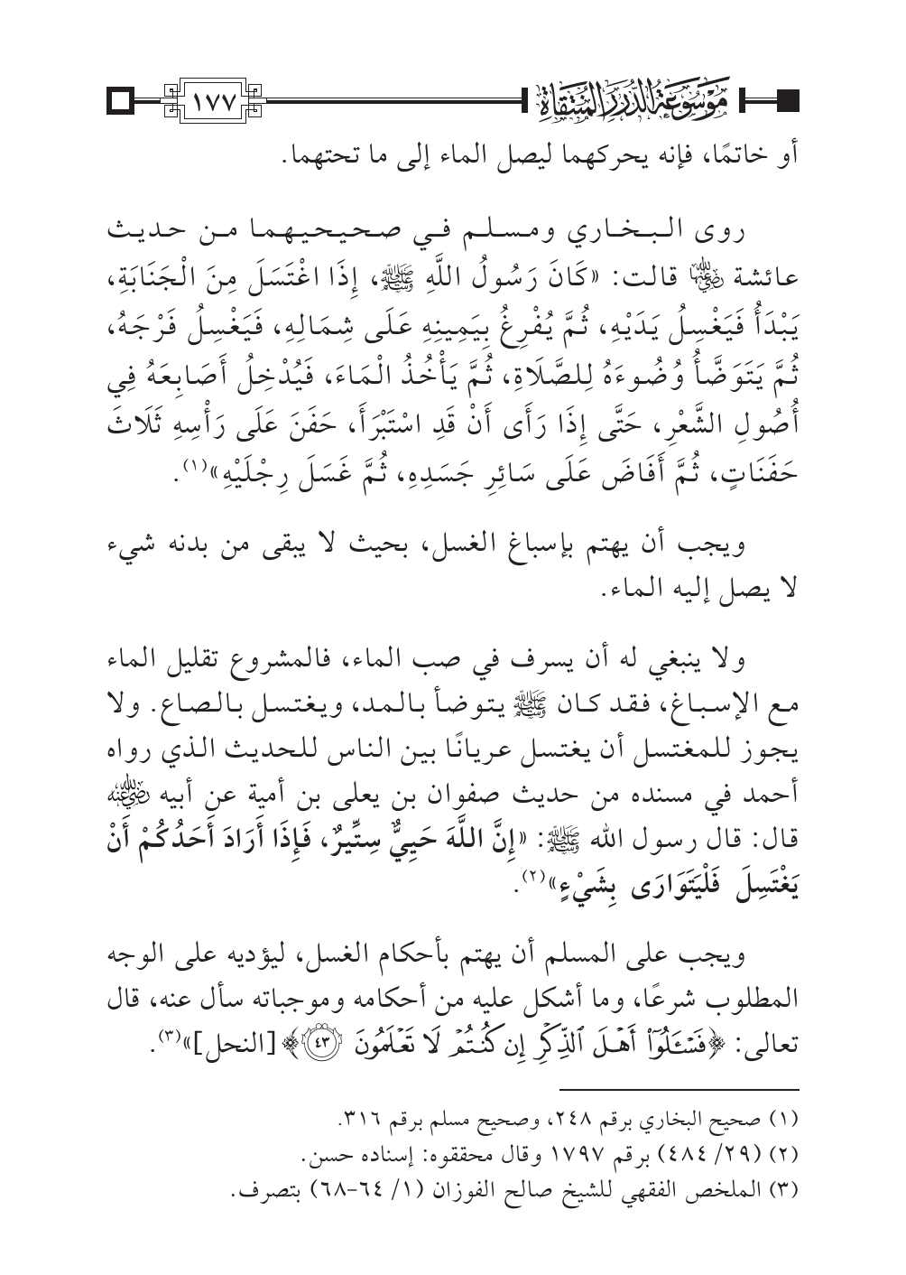 ويجب على المسلم أن يهتم بأحكام الغسل، ليؤديه على الوجه المطلوب شرعًا، وما أشكل عليه من أحكامه وموجباته سأل عنه، قال تعالى: {فَاسْأَلُوا أَهْلَ الذِّكْرِ إِنْ كُنْتُمْ لَا تَعْلَمُونَ (٤٣)} [النحل]» (¬٣).