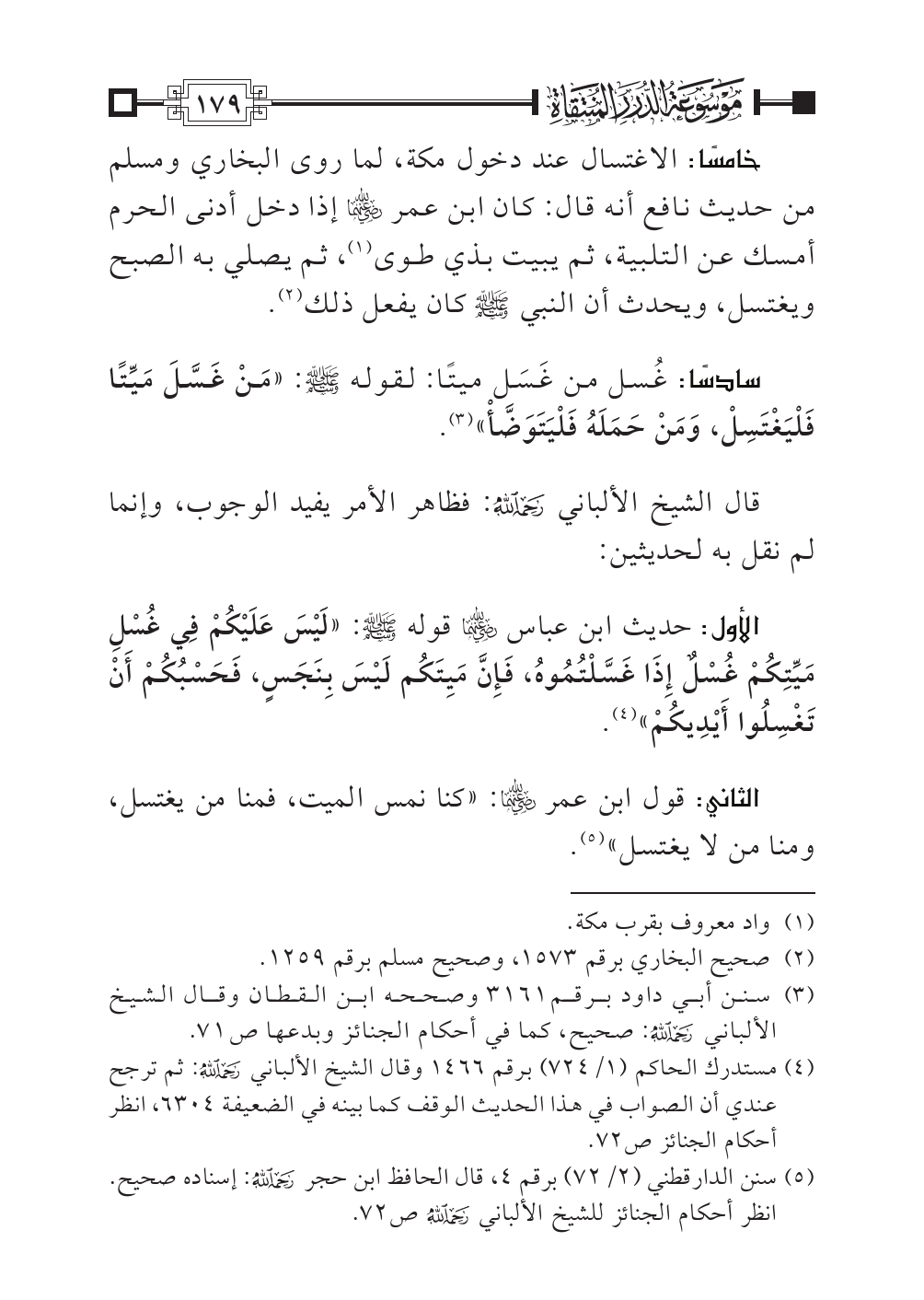 سادسًا: غُسل من غَسَل ميتًا: لقوله -صلى الله عليه وسلم-: «مَنْ غَسَّلَ مَيِّتًا فَلْيَغْتَسِلْ، وَمَنْ حَمَلَهُ فَلْيَتَوَضَّأْ» (¬٣).