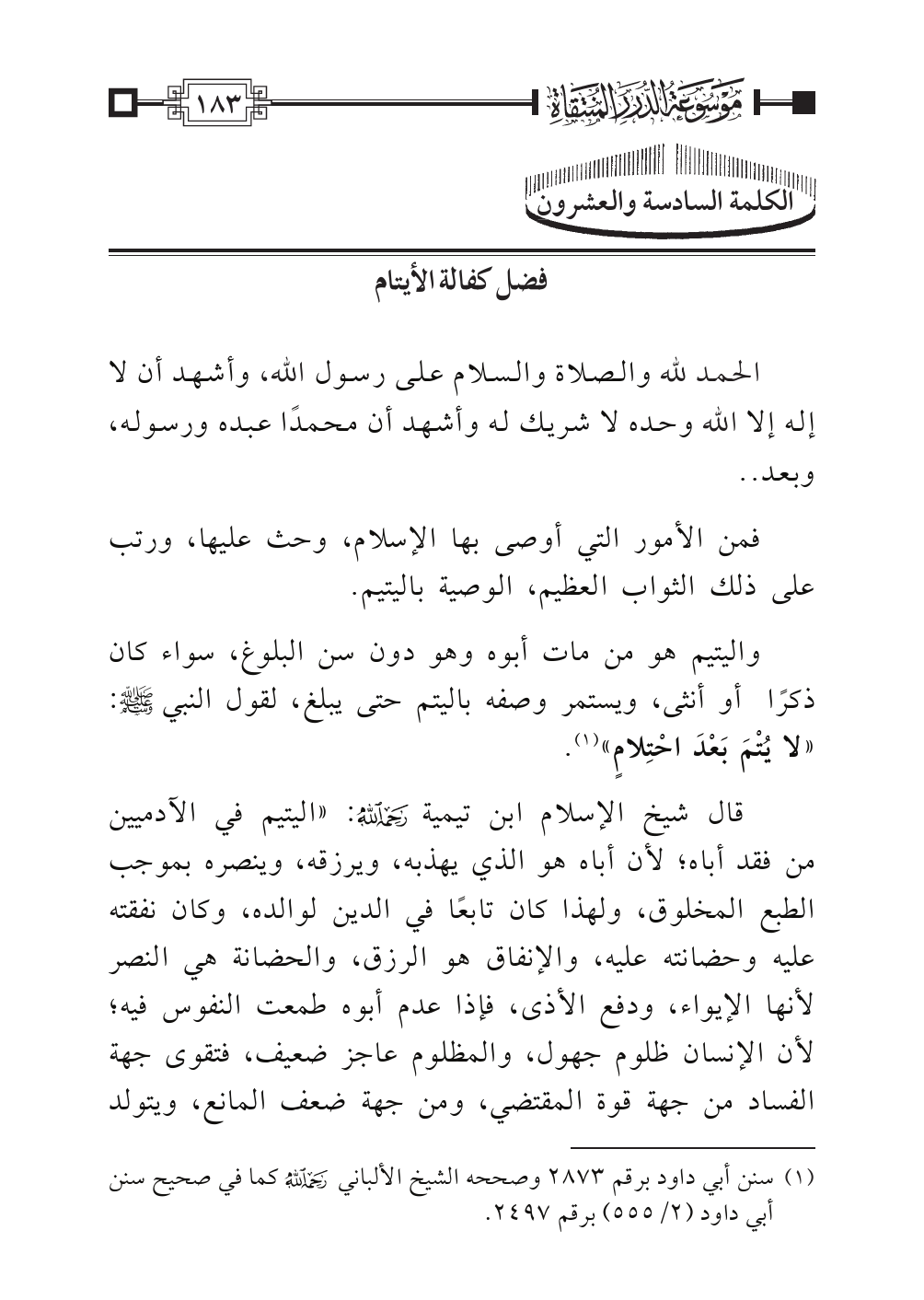 قال شيخ الإسلام ابن تيمية -رحمه الله-: «اليتيم في الآدميين من فقد أباه؛ لأن أباه هو الذي يهذبه، ويرزقه، وينصره بموجب الطبع المخلوق، ولهذا كان تابعًا في الدين لوالده، وكان نفقته عليه وحضانته عليه، والإنفاق هو الرزق، والحضانة هي النصر لأنها الإيواء، ودفع الأذى، فإذا عدم أبوه طمعت النفوس فيه؛ لأن الإنسان ظلوم جهول، والمظلوم عاجز ضعيف، فتقوى جهة الفساد من جهة قوة المقتضي، ومن جهة ضعف المانع، ويتولد