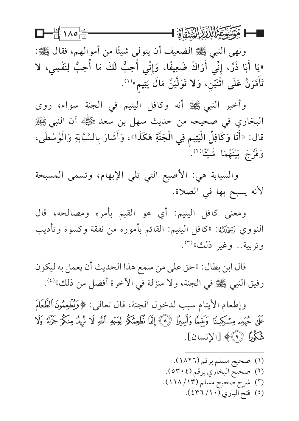 وأخبر النبي - صلى الله عليه وسلم - أنه وكافل اليتيم في الجنة سواء، روى البخاري في صحيحه من حديث سهل بن سعد -رضي الله عنه- أن النبي - صلى الله عليه وسلم - قال: «أَنَا وَكَافِلُ الْيَتِيمِ فِي الْجَنَّةِ هَكَذَا»، وَأَشَارَ بِالسَّبَّابَةِ وَالْوُسْطَى، وَفَرَّجَ بَيْنَهُمَا شَيْئًا (¬٢).
