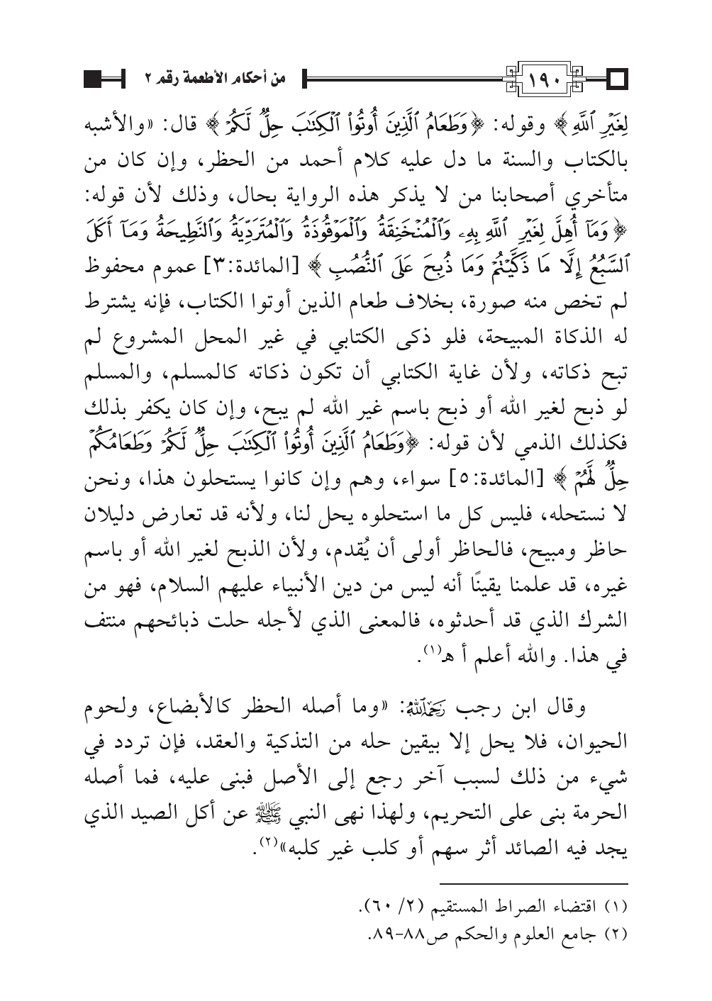 لِغَيْرِ اللَّهِ} وقوله: {وَطَعَامُ الَّذِينَ أُوتُوا الْكِتَابَ حِلٌّ لَكُمْ} قال: «والأشبه بالكتاب والسنة ما دل عليه كلام أحمد من الحظر، وإن كان من متأخري أصحابنا من لا يذكر هذه الرواية بحال، وذلك لأن قوله: {وَمَا أُهِلَّ لِغَيْرِ اللَّهِ بِهِ وَالْمُنْخَنِقَةُ وَالْمَوْقُوذَةُ وَالْمُتَرَدِّيَةُ وَالنَّطِيحَةُ وَمَا أَكَلَ السَّبُعُ إِلَّا مَا ذَكَّيْتُمْ وَمَا ذُبِحَ عَلَى النُّصُبِ} [المائدة: ٣] عموم محفوظ لم تخص منه صورة، بخلاف طعام الذين أوتوا الكتاب، فإنه يشترط له الذكاة المبيحة، فلو ذكى الكتابي في غير المحل المشروع لم تبح ذكاته، ولأن غاية الكتابي أن تكون ذكاته كالمسلم، والمسلم لو ذبح لغير الله أو ذبح باسم غير الله لم يبح، وإن كان يكفر بذلك فكذلك الذمي لأن قوله: {وَطَعَامُ الَّذِينَ أُوتُوا الْكِتَابَ حِلٌّ لَكُمْ وَطَعَامُكُمْ حِلٌّ لَهُمْ} [المائدة: ٥] سواء، وهم وإن كانوا يستحلون هذا، ونحن لا نستحله، فليس كل ما استحلوه يحل لنا، ولأنه قد تعارض دليلان حاظر ومبيح، فالحاظر أولى أن يُقدم، ولأن الذبح لغير الله أو باسم غيره، قد علمنا يقينًا أنه ليس من دين الأنبياء عليهم السلام، فهو من الشرك الذي قد أحدثوه، فالمعنى الذي لأجله حلت ذبائحهم منتف في هذا. والله أعلم أهـ (¬١).