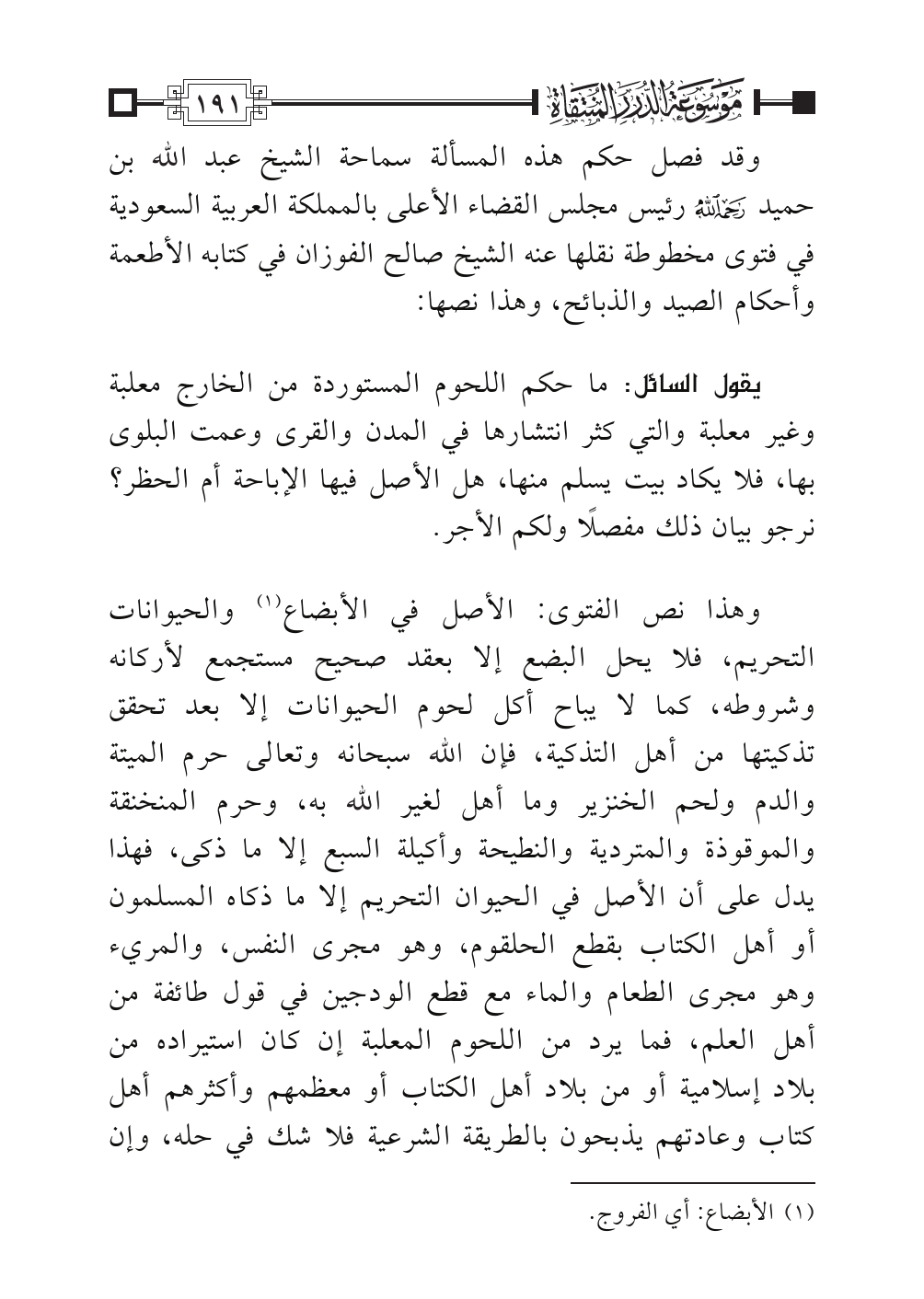 وقد فصل حكم هذه المسألة سماحة الشيخ عبد الله بن حميد -رحمه الله- رئيس مجلس القضاء الأعلى بالمملكة العربية السعودية في فتوى مخطوطة نقلها عنه الشيخ صالح الفوزان في كتابه الأطعمة وأحكام الصيد والذبائح، وهذا نصها: