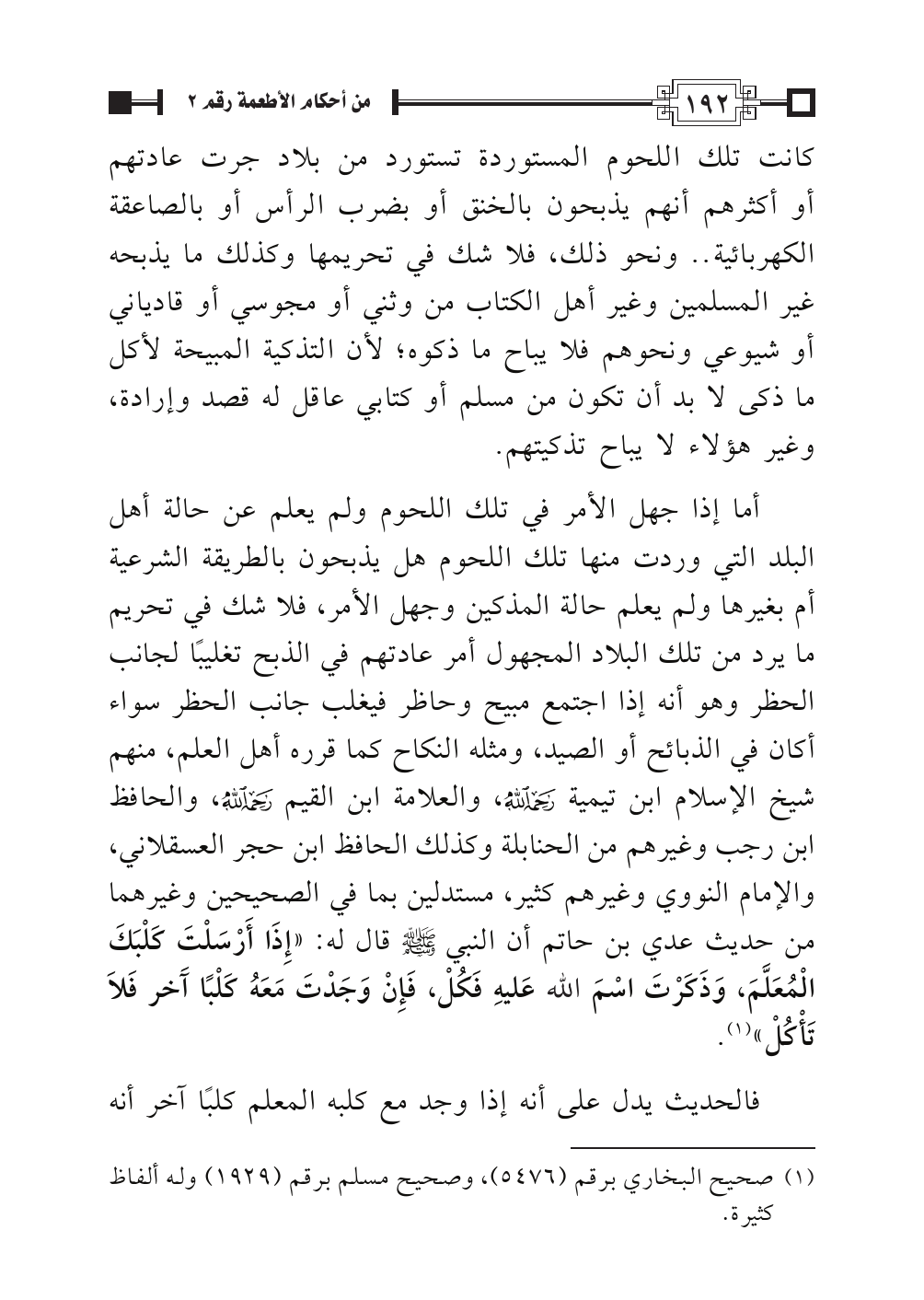 أما إذا جهل الأمر في تلك اللحوم ولم يعلم عن حالة أهل البلد التي وردت منها تلك اللحوم هل يذبحون بالطريقة الشرعية أم بغيرها ولم يعلم حالة المذكين وجهل الأمر، فلا شك في تحريم ما يرد من تلك البلاد المجهول أمر عادتهم في الذبح تغليبًا لجانب الحظر وهو أنه إذا اجتمع مبيح وحاظر فيغلب جانب الحظر سواء أكان في الذبائح أو الصيد، ومثله النكاح كما قرره أهل العلم، منهم شيخ الإسلام ابن تيمية -رحمه الله-، والعلامة ابن القيم -رحمه الله-، والحافظ ابن رجب وغيرهم من الحنابلة وكذلك الحافظ ابن حجر العسقلاني، والإمام النووي وغيرهم كثير، مستدلين بما في الصحيحين وغيرهما من حديث عدي بن حاتم أن النبي -صلى الله عليه وسلم- قال له: «إِذَا أَرْسَلْتَ كَلْبَكَ الْمُعَلَّمَ، وَذَكَرْتَ اسْمَ الله عَليهِ فَكُلْ، فَإِنْ وَجَدْتَ مَعَهُ كَلْبًا آَخر فَلَا تَأْكُلْ» (¬١).