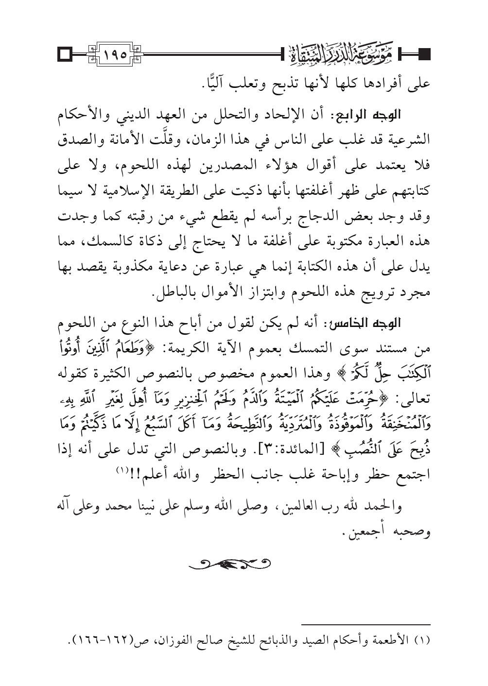 (¬١). الأطعمة وأحكام الصيد والذبائح للشيخ صالح الفوزان، ص (١٦٢ - ١٦٦).