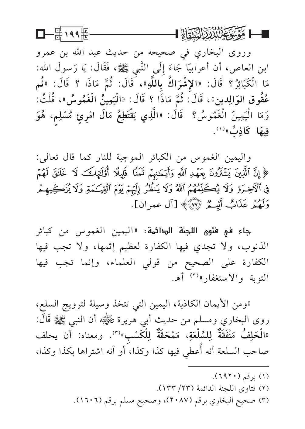 وروى البخاري في صحيحه من حديث عبد الله بن عمرو ابن العاص، أن أعرابيًا جَاءَ إِلَى النَّبيِ -صلى الله عليه وسلم-، فَقَالَ: يَا رَسولَ الله: مَا الْكَبَائِرُ؟ قَالَ: «الإِشْرَاكُ بِاللَّهِ»، قَالَ: ثُمَّ مَاذَا؟ قَالَ: «ثُم عُقُوق الوَالِدين»، قَالَ: ثُمَّ مَاذَا؟ قَالَ: «الْيَمِينُ الْغَمُوسُ»، قُلْتُ: وَمَا الْيَمِينُ الْغَمُوسُ؟ قَالَ: «الَّذِي يَقْتَطِعُ مَالَ امْرِئٍ مُسْلِمٍ، هُوَ فِيهَا كَاذِبٌ» (¬١).