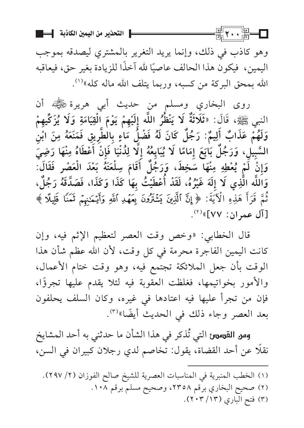 روى البخاري ومسلم من حديث أبي هريرة -رضي الله عنه- أن النبي -صلى الله عليه وسلم-، قَالَ: «ثَلَاثَةٌ لَا يَنْظُرُ اللَّه إِلَيْهِمْ يَوْمَ الْقِيَامَةِ وَلَا يُزَكِّيهِمْ وَلَهُمْ عَذَابٌ أَلِيمٌ: رَجُلٌ كَانَ لَهُ فَضْلُ مَاءٍ بِالطَّرِيقِ فَمَنَعَهُ مِنَ ابْنِ السَّبِيلِ، وَرَجُلٌ بَايَعَ إِمَامًا لَا يُبَايِعُهُ إِلَّا لِدُنْيَا فَإِنْ أَعْطَاهُ مِنْهَا رَضِيَ وَإِنْ لَمْ يُعْطِهِ مِنْهَا سَخِطَ، وَرَجُلٌ أَقَامَ سِلْعَتَهُ بَعْدَ الْعَصْر فَقَالَ: وَاللَّه الَّذِي لَا إِلَهَ غَيْرُهُ، لَقَدْ أُعْطَيْتُ بِهَا كَذَا وَكَذَا، فَصَدَّقَهُ رَجُلٌ، ثُمَّ قَرَأَ هَذِهِ الْآيَةَ: {إِنَّ الَّذِينَ يَشْتَرُونَ بِعَهْدِ اللَّهِ وَأَيْمَانِهِمْ ثَمَنًا قَلِيلًا} [آل عمران: ٧٧]» (¬٢).