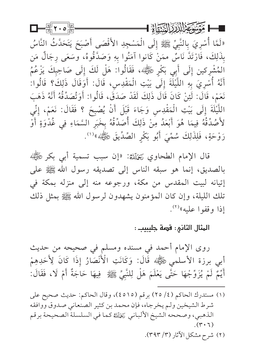 «لَمَّا أُسْرِيَ بِالنَّبِيِّ - صلى الله عليه وسلم - إِلَى الْمَسْجِدِ الأَقْصَى أَصْبَحَ يَتَحَدَّثُ النَّاسُ بِذَلِكَ، فَارْتَدَّ نَاسٌ ممَنْ كَانوا آمَنُوا بِهِ وَصَدَّقُوهُ، وسَعَى رِجَالٌ مَن المُشْرِكين إِلَى أَبِي بَكْرٍ -رضي الله عنه-، فَقَالُوا: هَلْ لَكَ إِلَى صَاحِبِكَ يَزْعُمُ أَنَّهُ أُسْرِيَ بِهِ اللَّيْلَةَ إِلَى بَيْتِ الْمَقْدِسِ، قَالَ: أَوَقَالَ ذَلِكَ؟ قَالُوا: نَعَمْ، قَالَ: لَئِنْ كَانَ قَالَ ذَلِكَ لَقَدْ صَدَقَ، قَالُوا: أَوَتُصَدِّقُهُ أَنَّهُ ذَهَبَ اللَّيْلَةَ إِلَى بَيْتِ الْمَقْدِسِ وَجَاءَ قَبْلَ أَنْ يُصْبِحَ؟ فَقَالَ: نَعَمْ، إِنِّي لأَصُدِّقُهُ فِيمَا هُوَ أَبْعَدُ مِنْ ذَلِكَ أُصَدِّقُهُ بِخَبَرِ السَّمَاءِ فِي غُدْوَةٍ أَوْ رَوْحَةٍ، فَلِذَلِكَ سُمِّيَ أَبُو بَكْرٍ الصِّدِّيقَ -رضي الله عنه-» (¬١).
