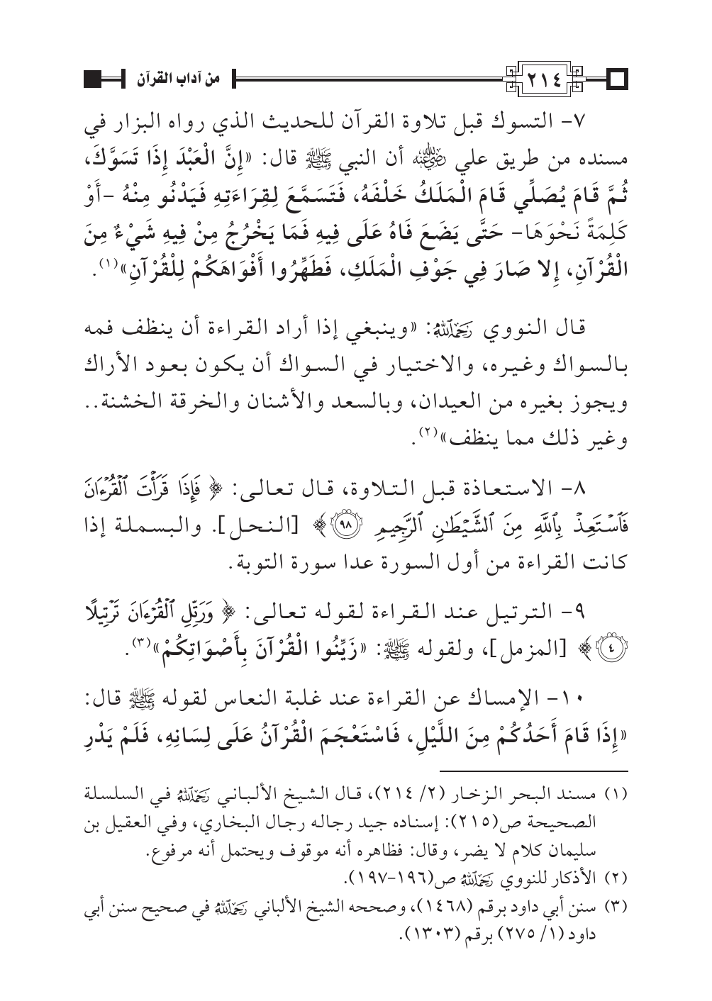 ٧ - التسوك قبل تلاوة القرآن للحديث الذي رواه البزار في مسنده من طريق علي -رضي الله عنه- أن النبي - صلى الله عليه وسلم - قال: «إِنَّ الْعَبْدَ إِذَا تَسَوَّكَ، ثُمَّ قَامَ يُصَلِّي قَامَ الْمَلَكُ خَلْفَهُ، فَتَسَمَّعَ لِقِرَاءَتِهِ فَيَدْنُو مِنْهُ -أَوْ كَلِمَةً نَحْوَهَا- حَتَّى يَضَعَ فَاهُ عَلَى فِيهِ فَمَا يَخْرُجُ مِنْ فِيهِ شَيْءٌ مِنَ الْقُرْآنِ، إِلا صَارَ فِي جَوْفِ الْمَلَكِ، فَطَهِّرُوا أَفْوَاهَكُمْ لِلْقُرْآنِ» (¬١).