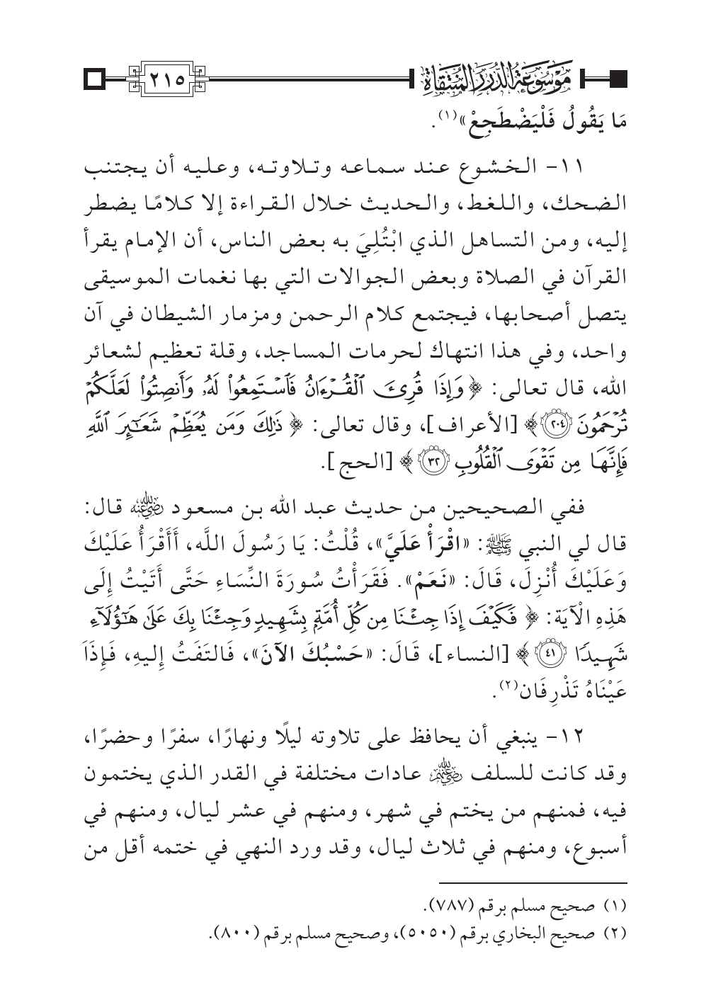 ١١ - الخشوع عند سماعه وتلاوته، وعليه أن يجتنب الضحك، واللغط، والحديث خلال القراءة إلا كلامًا يضطر إليه، ومن التساهل الذي ابْتُلِيَ به بعض الناس، أن الإمام يقرأ القرآن في الصلاة وبعض الجوالات التي بها نغمات الموسيقى يتصل أصحابها، فيجتمع كلام الرحمن ومزمار الشيطان في آن واحد، وفي هذا انتهاك لحرمات المساجد، وقلة تعظيم لشعائر الله، قال تعالى: {وَإِذَا قُرِئَ الْقُرْآنُ فَاسْتَمِعُوا لَهُ وَأَنْصِتُوا لَعَلَّكُمْ تُرْحَمُونَ (٢٠٤)} [الأعراف]، وقال تعالى: {ذَلِكَ وَمَنْ يُعَظِّمْ شَعَائِرَ اللَّهِ فَإِنَّهَا مِنْ تَقْوَى الْقُلُوبِ (٣٢)} [الحج].