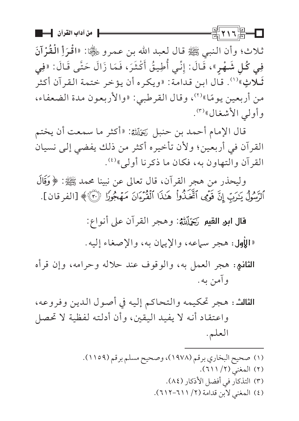 ثلاث؛ وأن النبي - صلى الله عليه وسلم - قال لعبد الله بن عمرو -رضي الله عنهما-: «اقْرَأِ الْقُرْآنَ فِي كُلِ شَهْرٍ»، قَالَ: إِنِّي أُطِيقُ أَكْثَرَ، فَمَا زَالَ حَتَّى قَالَ: «فِي ثَلاثٍ» (¬١).