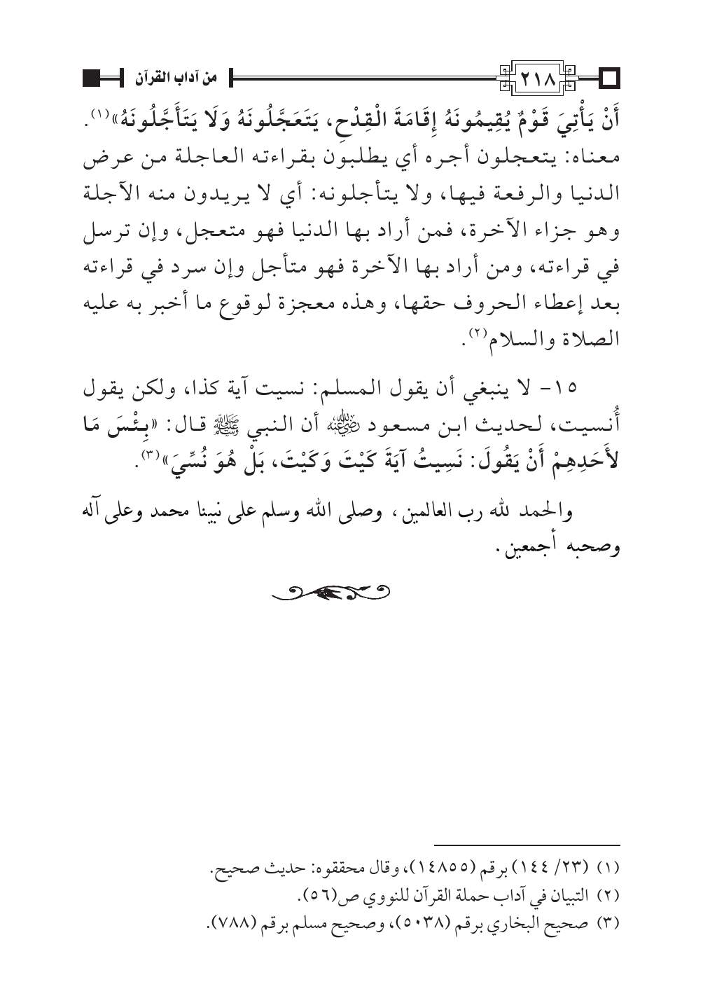 ١٥ - لا ينبغي أن يقول المسلم: نسيت آية كذا، ولكن يقول أُنسيت، لحديث ابن مسعود -رضي الله عنه- أن النبي - صلى الله عليه وسلم - قال: «بِئْسَ مَا لأَحَدِهِمْ أَنْ يَقُولَ: نَسِيتُ آيَةَ كَيْتَ وَكَيْتَ، بَلْ هُوَ نُسِّيَ» (¬٣).