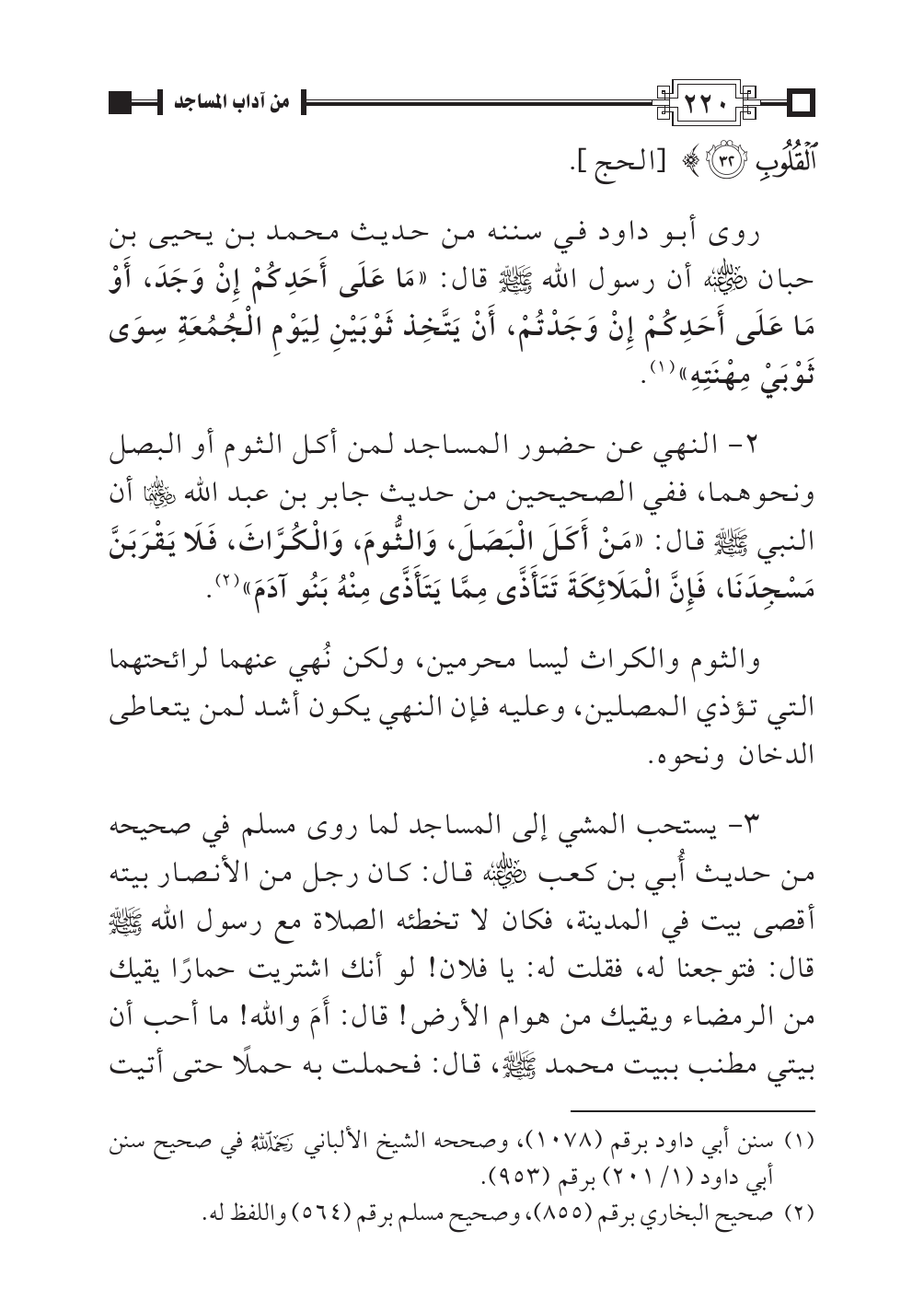 ٢ - النهي عن حضور المساجد لمن أكل الثوم أو البصل ونحوهما، ففي الصحيحين من حديث جابر بن عبد الله -رضي الله عنهما- أن النبي - صلى الله عليه وسلم - قال: «مَنْ أَكَلَ الْبَصَلَ، وَالثُّومَ، وَالْكُرَّاثَ، فَلَا يَقْرَبَنَّ مَسْجِدَنَا، فَإِنَّ الْمَلَائِكَةَ تَتَأَذَّى مِمَّا يَتَأَذَّى مِنْهُ بَنُو آدَمَ» (¬٢).