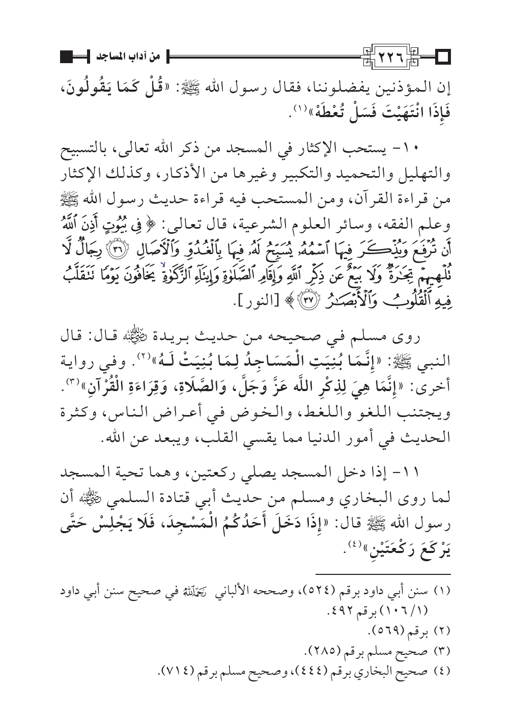 روى مسلم في صحيحه من حديث بريدة -رضي الله عنه- قال: قال النبي - صلى الله عليه وسلم -: «إِنَّمَا بُنِيَتِ الْمَسَاجِدُ لِمَا بُنِيَتْ لَهُ» (¬٢). وفي رواية أخرى: «إِنَّمَا هِيَ لِذِكْرِ اللَّه عَزَّ وَجَلَّ، وَالصَّلَاةِ، وَقِرَاءَةِ الْقُرْآنِ» (¬٣). ويجتنب اللغو واللغط، والخوض في أعراض الناس، وكثرة الحديث في أمور الدنيا مما يقسي القلب، ويبعد عن الله.