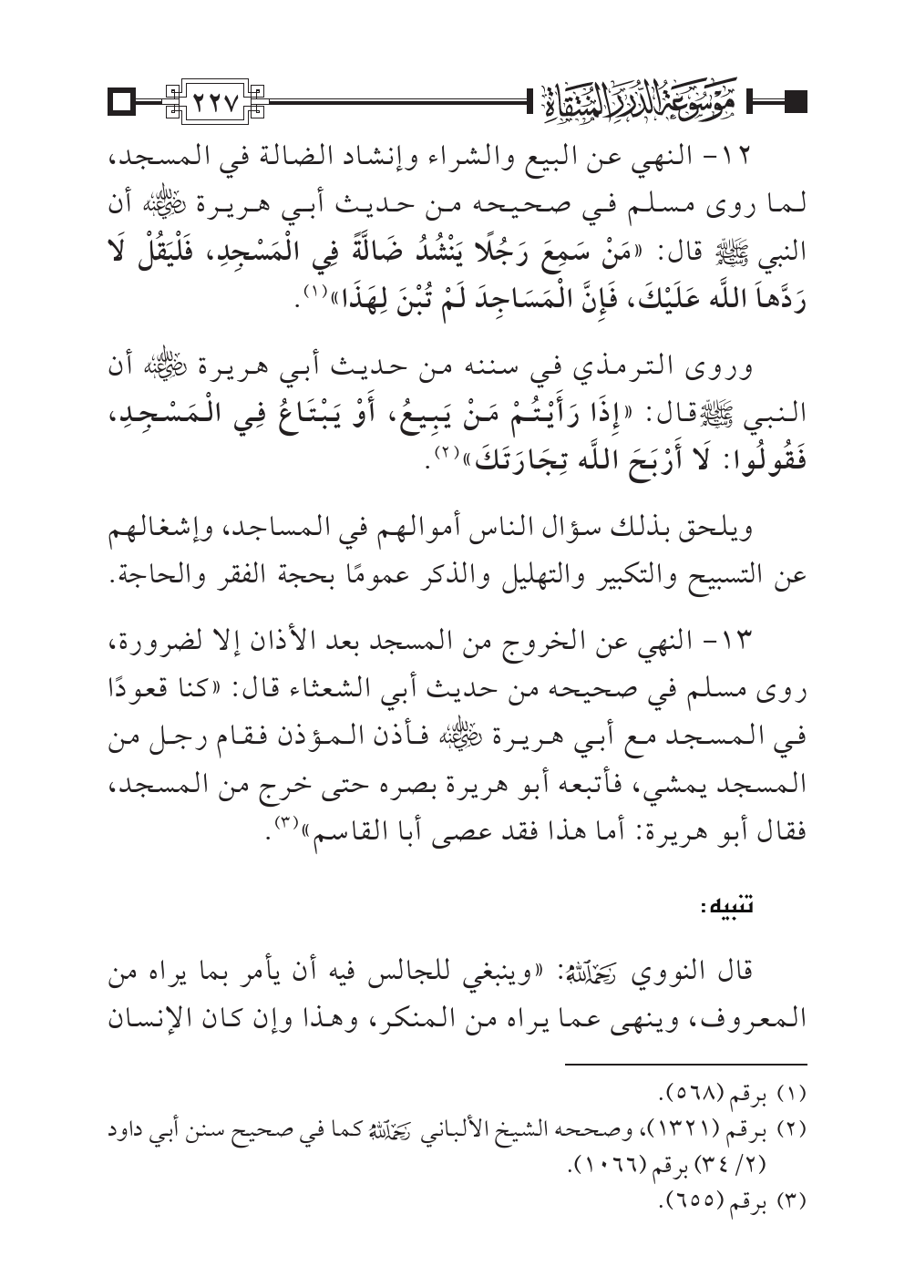 ١٣ - النهي عن الخروج من المسجد بعد الأذان إلا لضرورة، روى مسلم في صحيحه من حديث أبي الشعثاء قال: «كنا قعودًا في المسجد مع أبي هريرة -رضي الله عنه- فأذن المؤذن فقام رجل من المسجد يمشي، فأتبعه أبو هريرة بصره حتى خرج من المسجد، فقال أبو هريرة: أما هذا فقد عصى أبا القاسم» (¬٣).