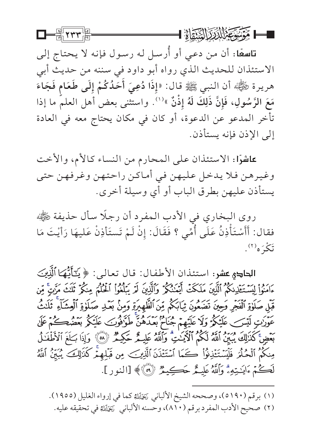 تاسعًا: أن من دعي أو أُرسل له رسول فإنه لا يحتاج إلى الاستئذان للحديث الذي رواه أبو داود في سننه من حديث أبي هريرة -رضي الله عنه- أن النبي - صلى الله عليه وسلم - قال: «إِذَا دُعِيَ أَحَدُكُمْ إِلَى طَعَامٍ فَجَاءَ مَعَ الرَّسُولِ، فَإِنَّ ذَلِكَ لَهُ إِذْنٌ» (¬١). واستثنى بعض أهل العلم ما إذا تأخر المدعو عن الدعوة، أو كان في مكان يحتاج معه في العادة إلى الإذن فإنه يستأذن.