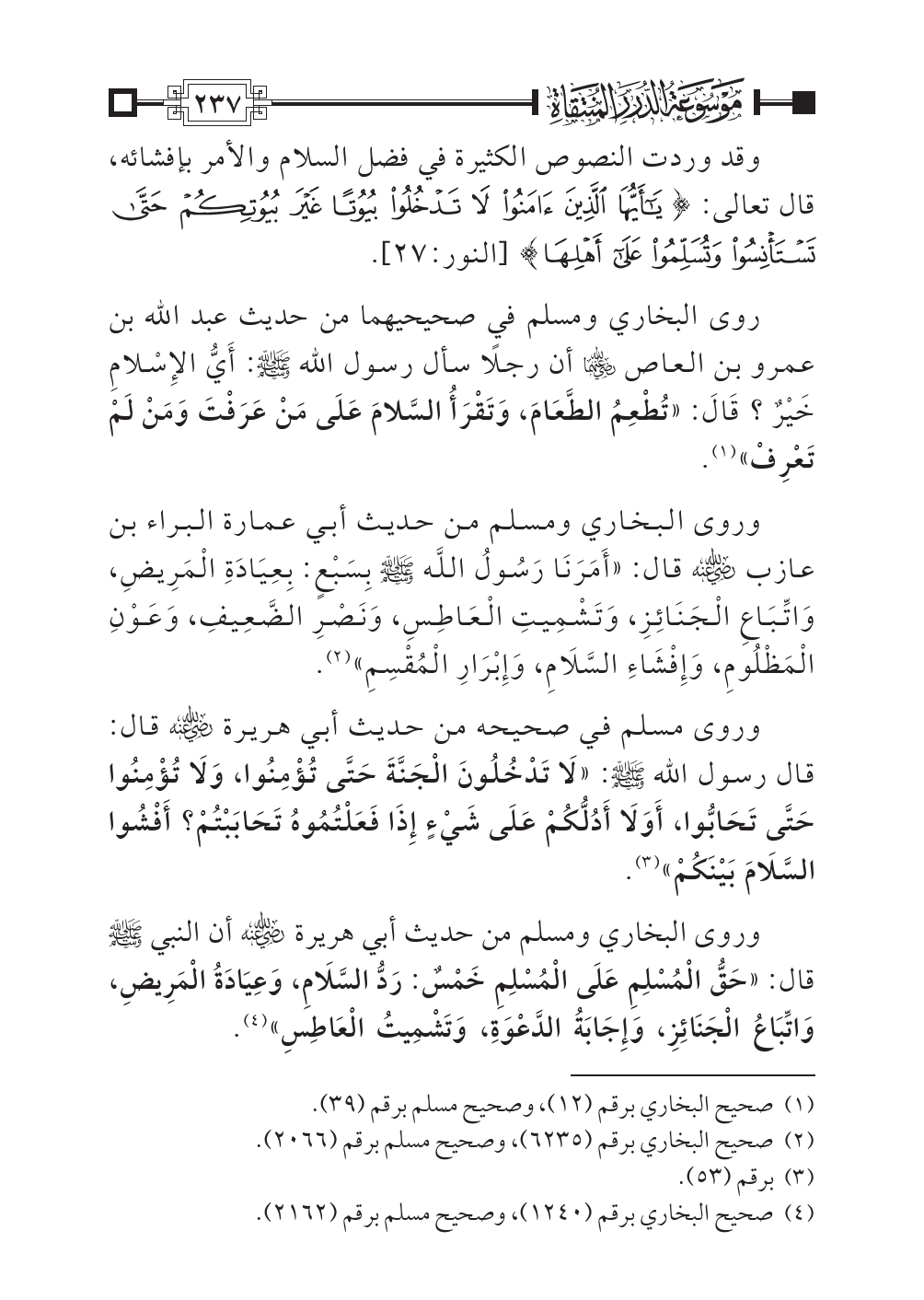 وروى مسلم في صحيحه من حديث أبي هريرة -رضي الله عنه- قال: قال رسول الله - صلى الله عليه وسلم -: «لَا تَدْخُلُونَ الْجَنَّةَ حَتَّى تُؤْمِنُوا، وَلَا تُؤْمِنُوا حَتَّى تَحَابُّوا، أَوَلَا أَدُلُّكُمْ عَلَى شَيْءٍ إِذَا فَعَلْتُمُوهُ تَحَابَبْتُمْ؟ أَفْشُوا السَّلَامَ بَيْنَكُمْ» (¬٣).