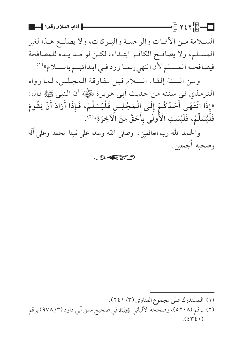 ومن السنة إلقاء السلام قبل مفارقة المجلس، لما رواه الترمذي في سننه من حديث أبي هريرة -رضي الله عنه- أن النبي - صلى الله عليه وسلم - قال: «إِذَا انْتَهَى أَحَدُكُمْ إِلَى الْمَجْلِسِ فَلْيُسَلِّمْ، فَإِذَا أَرَادَ أَنْ يَقُومَ فَلْيُسَلِّمْ، فَلَيْسَتِ الْأُولَى بِأَحَقَّ مِنَ الْآخِرَةِ» (¬٢).